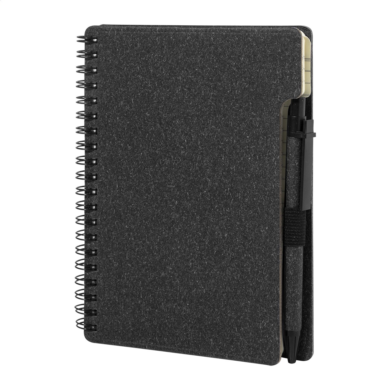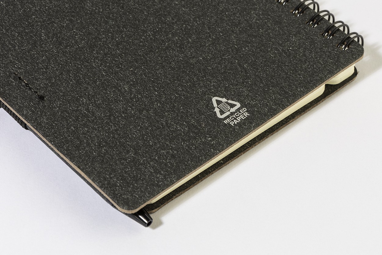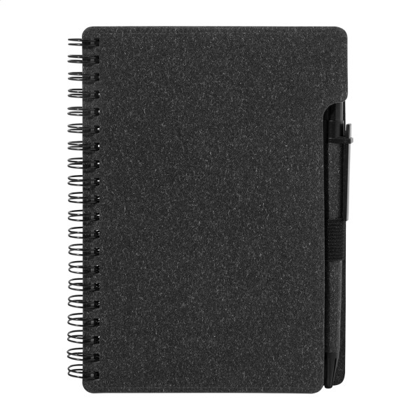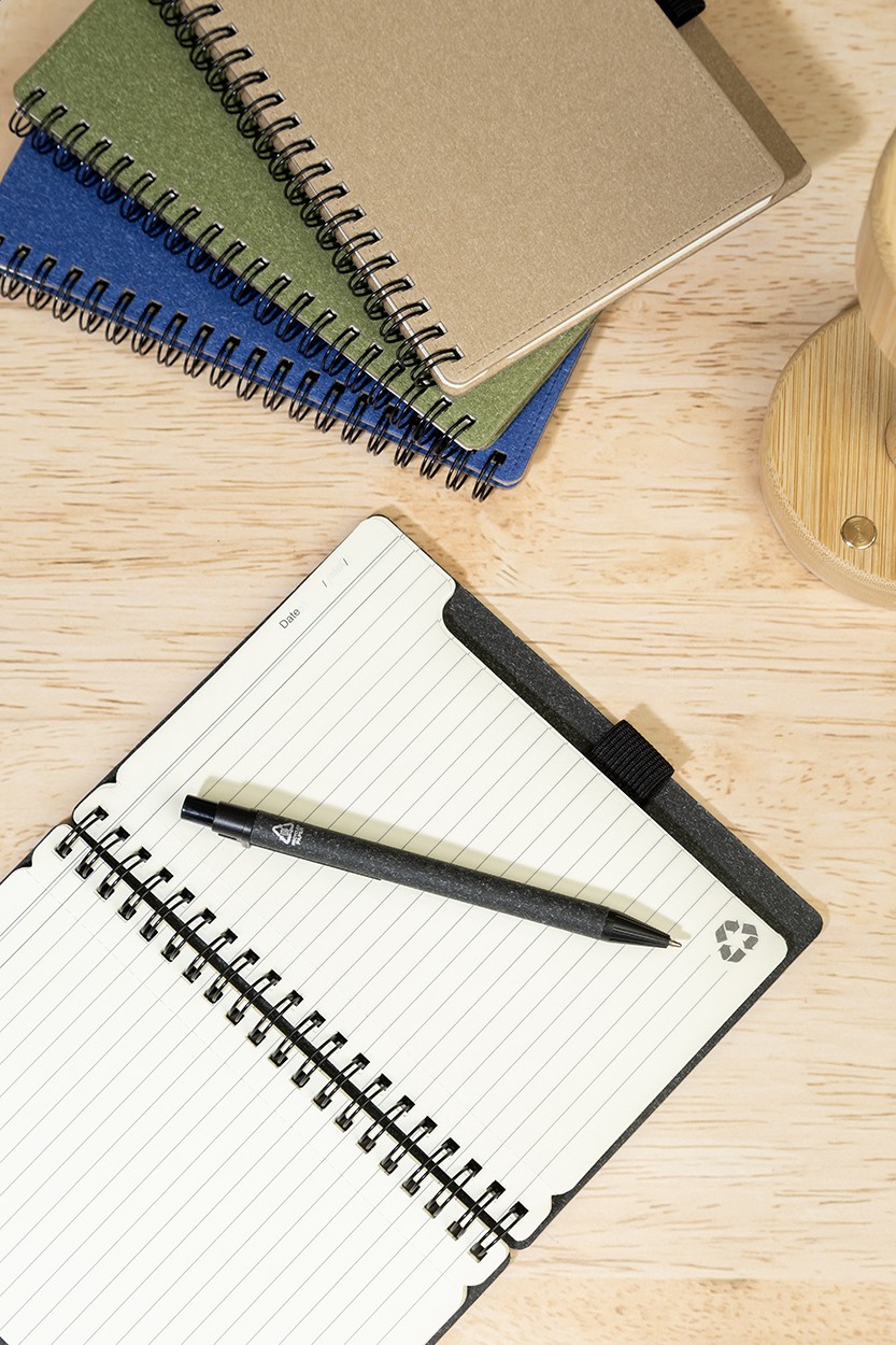 Caiet cu spirală, din hârtie reciclată, cu 80 de file dictando. Format A6. Include hârtie reciclată și pix din PP reciclat cu mină albastră.