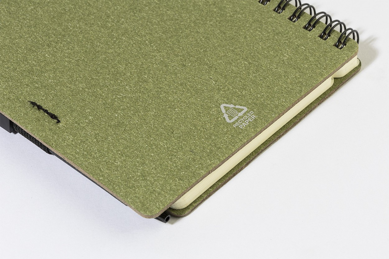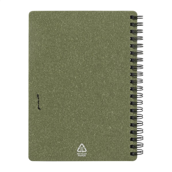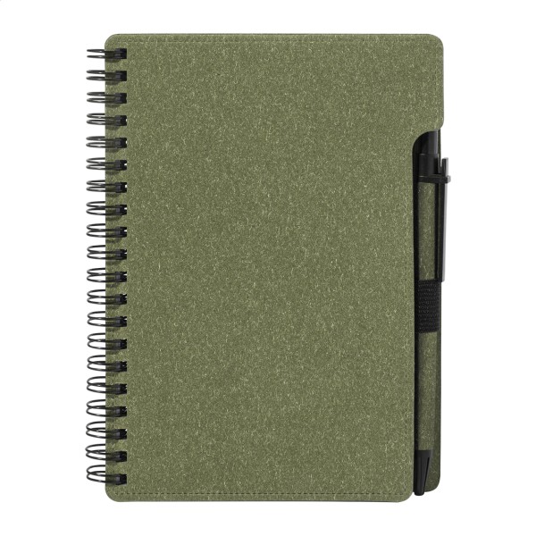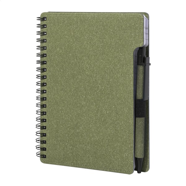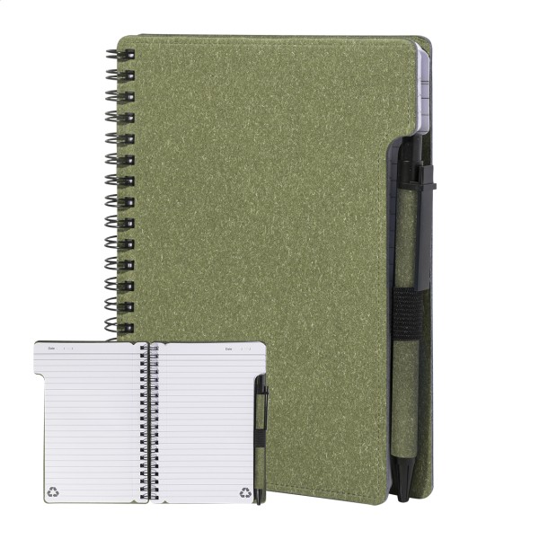 Caiet cu spirală, din hârtie reciclată, cu 80 de file dictando. Format A6. Include hârtie reciclată și pix din PP reciclat cu mină albastră.