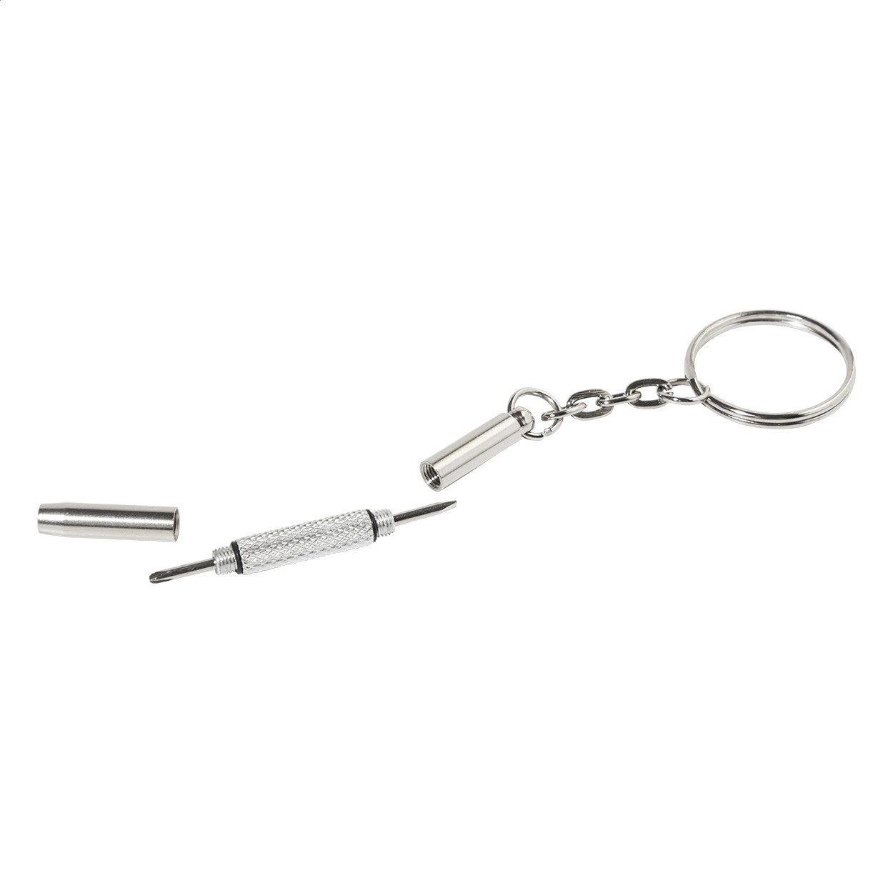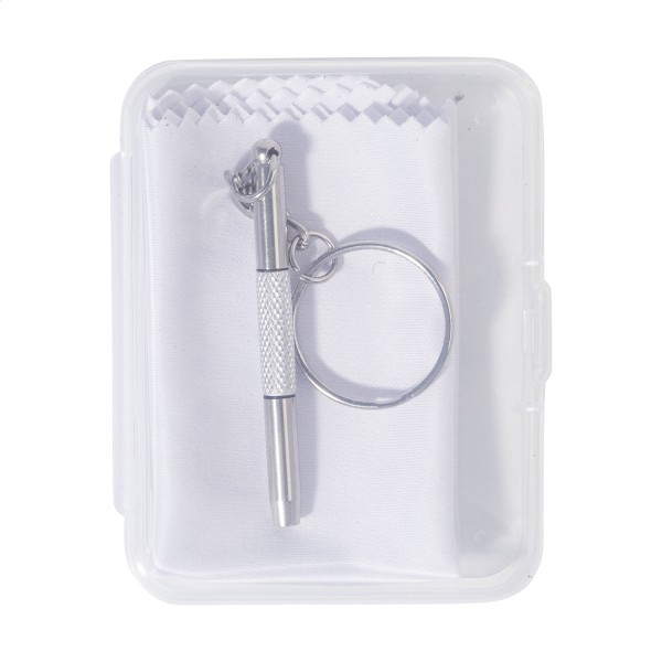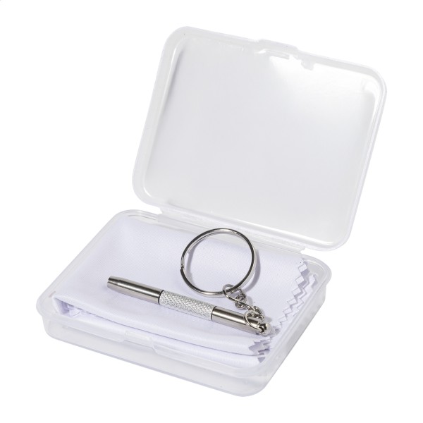 Set compact de reparare a ochelarilor, în cutie transparentă din PP. Include o cârpă de curățare din microfibră 100% RPET (220 g/m²) și o mini-șurubelniță cu breloc. Dimensiunea cârpei: 18×15 cm.