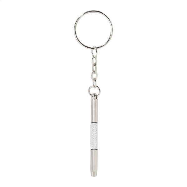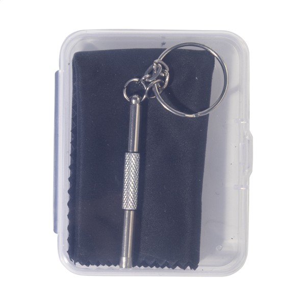 Set compact de reparare a ochelarilor, în cutie transparentă din PP. Include o cârpă de curățare din microfibră 100% RPET (220 g/m²) și o mini-șurubelniță cu breloc. Dimensiunea cârpei: 18×15 cm.