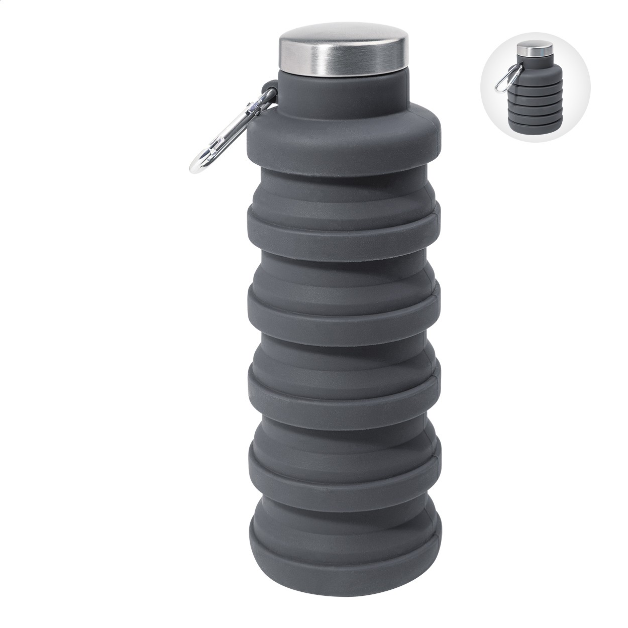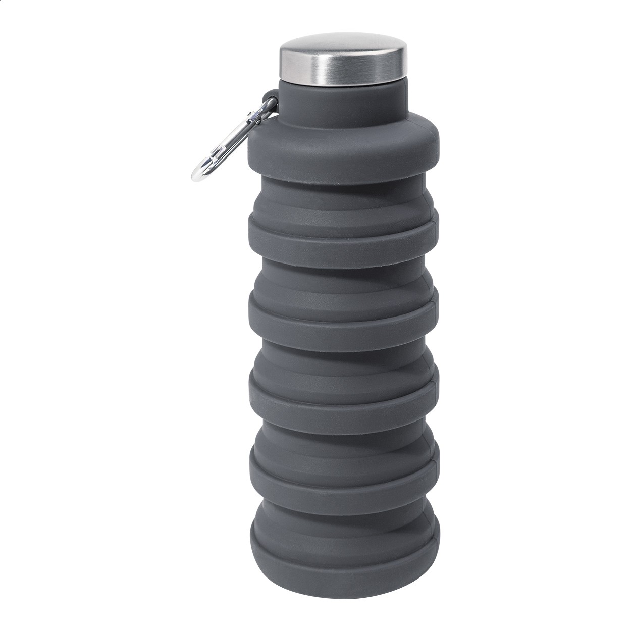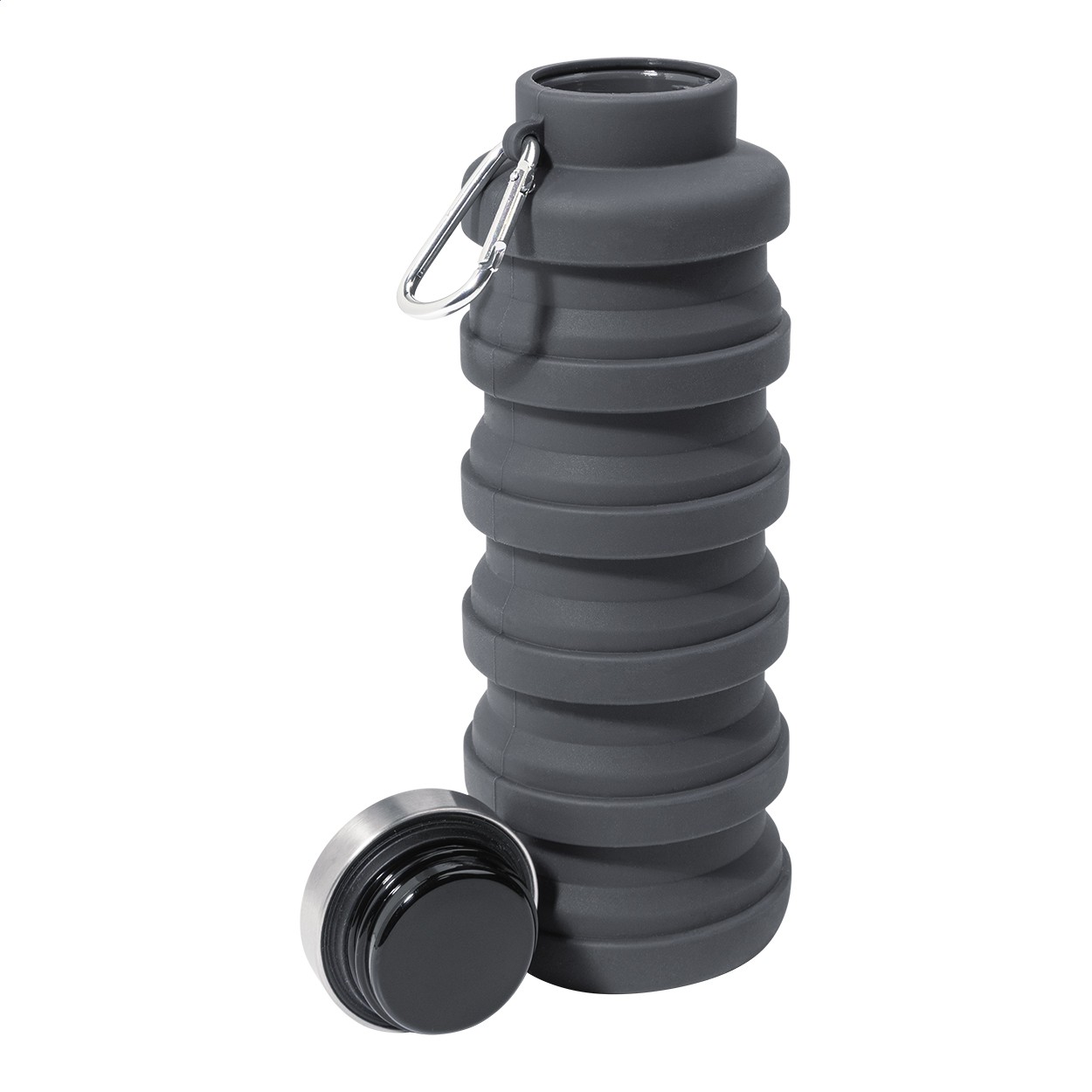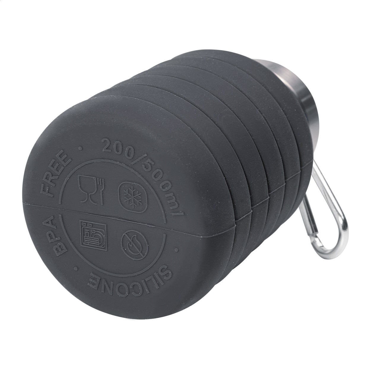 Sticlă pliabilă, din silicon, cu capac din oțel inoxidabil și carabină din aluminiu. 500 ml.