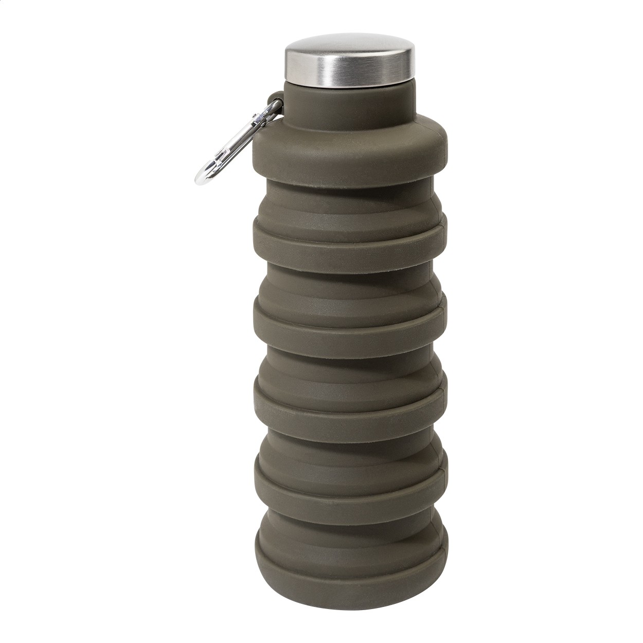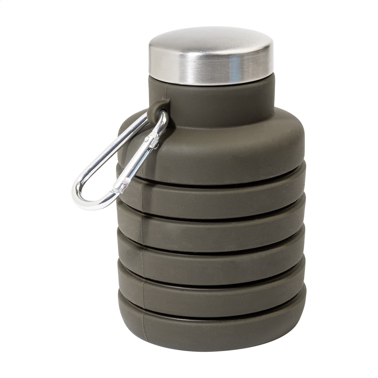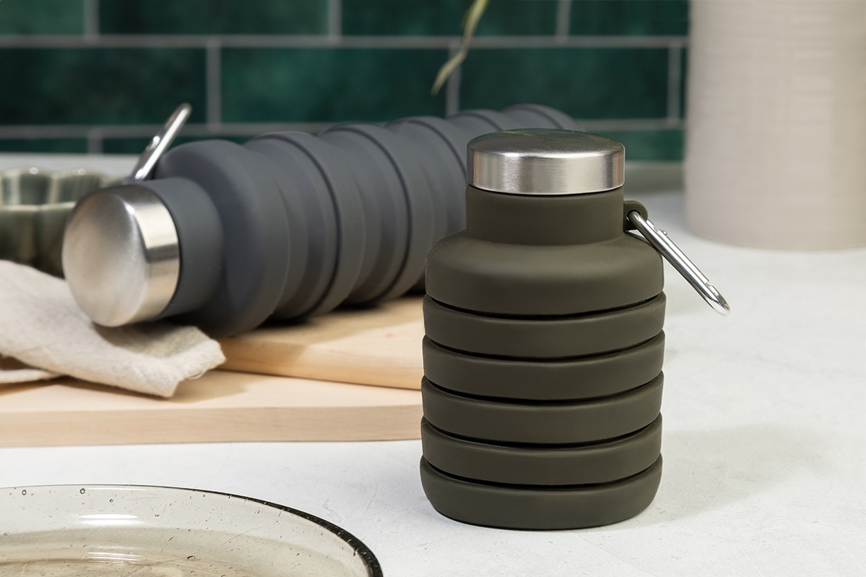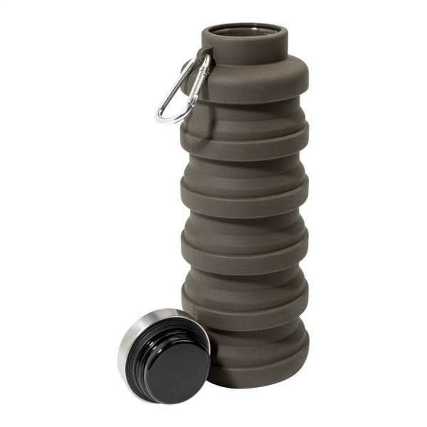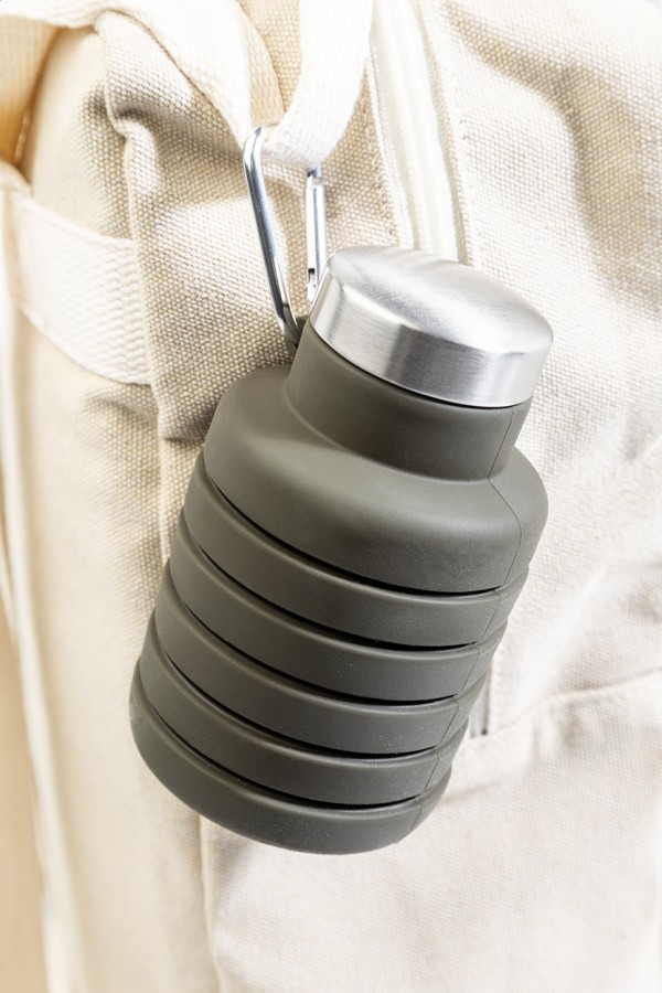 Sticlă pliabilă, din silicon, cu capac din oțel inoxidabil și carabină din aluminiu. 500 ml.
