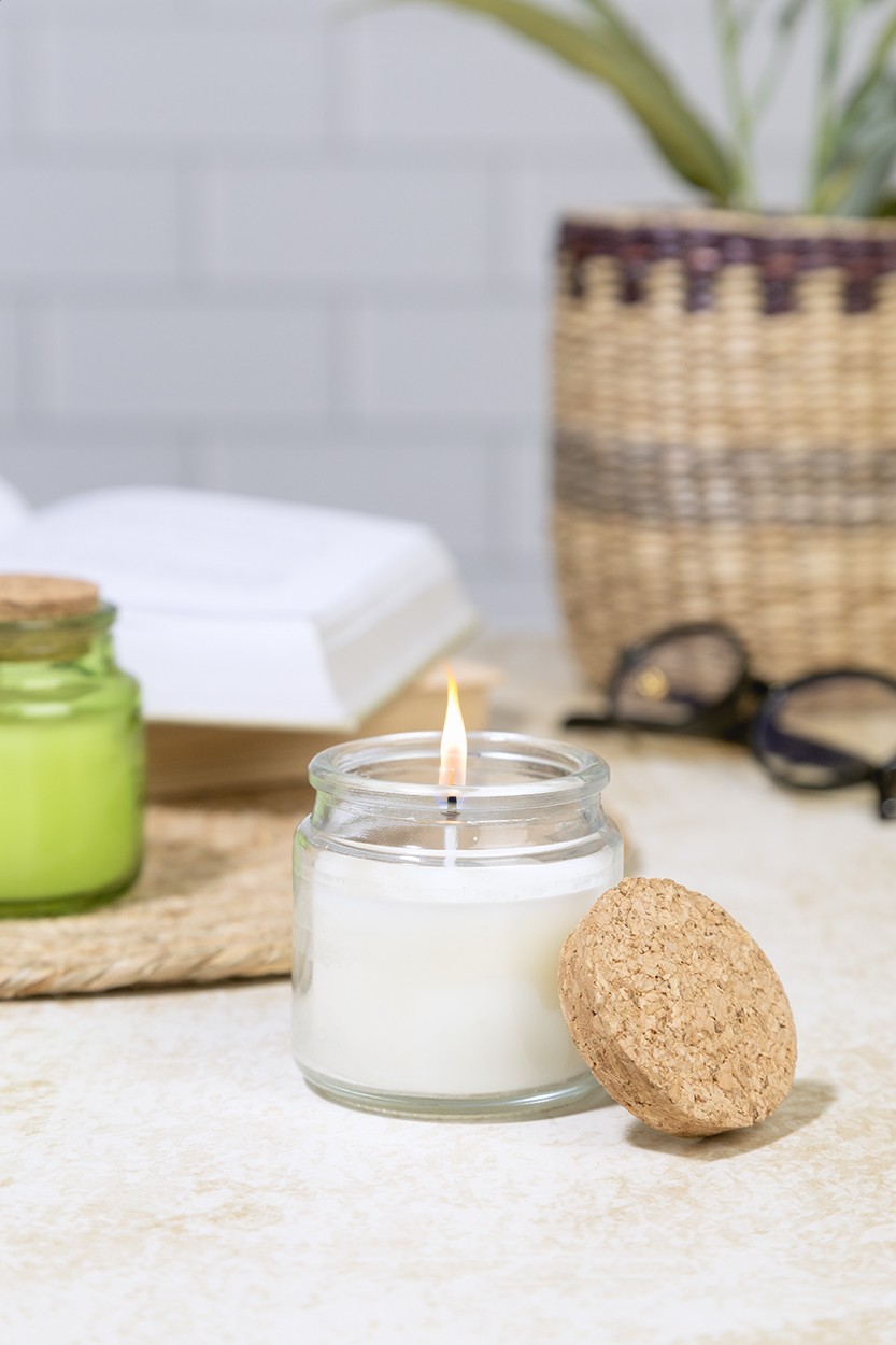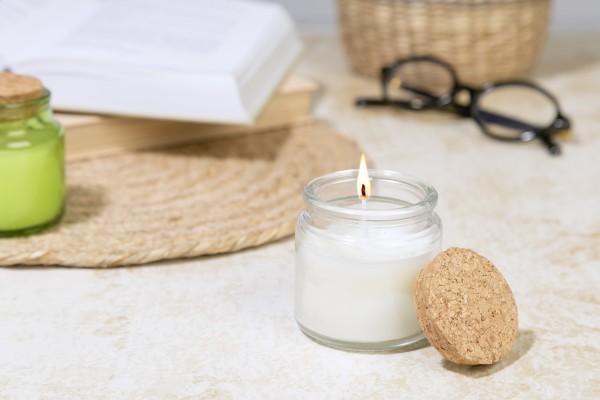 Lumânare din ceară vegetală, cu aromă de vanilie, în suport de sticlă cu capac din plută naturală. Conține 80 de grame de ceară. Durată de ardere: 16 ore. În cutie din hârtie kraft.