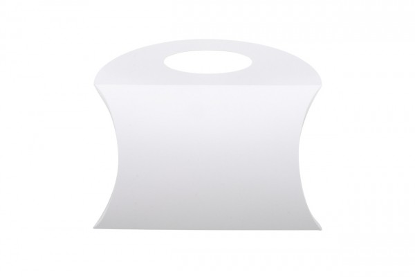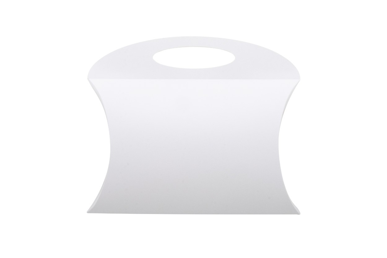 Cutie in formă de pernă, din carton, imprimată la comandă, cu mâner. Livrat ambalat plat. MOQ: 50 buc.