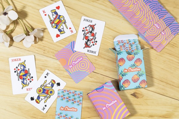 Cărți de joc clasice, personalizate, în format mini, pentru călătorii, în cutie de hârtie. Un pachet standard cu 54 de cărți. Prețul include cutia imprimată color și o imprimare color identică pe spatele fiecărei cărți. Cantitate minimă de comandă: 100 bucăți.
