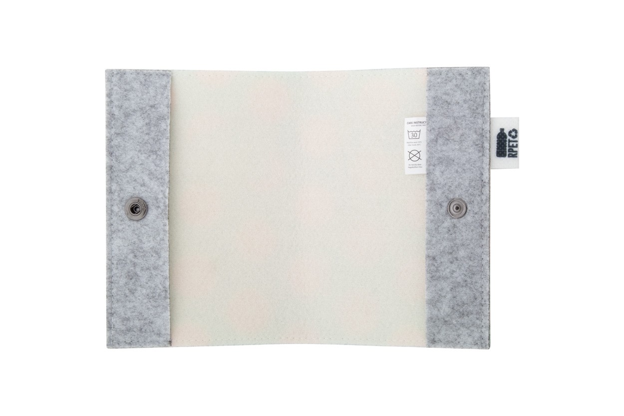 Husă pentru pașaport, din pâslă RPET, realizată la comandă, cu husă imprimată color și închidere cu capsă. Cu etichetă distinctivă RPET. Pretul include imprimarea prin sublimare. MOQ: 50 buc.