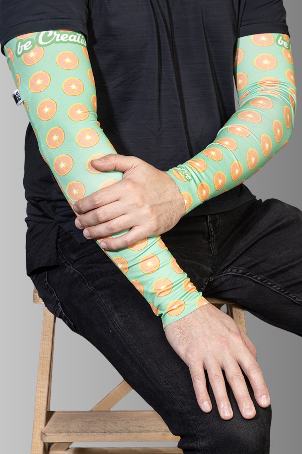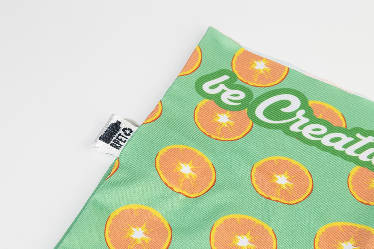O pereche de manșete elastice, RPET, personalizate, cu imprimeu sublimat pe toată suprafața. 92% poliester RPET și 8% elastan (185 g/m²), cu etichetă RPET distinctivă. Cantitate minimă de comandă: 50 buc. Mărimi: M (8×12×48 cm), L (9,5×13,5×52 cm).