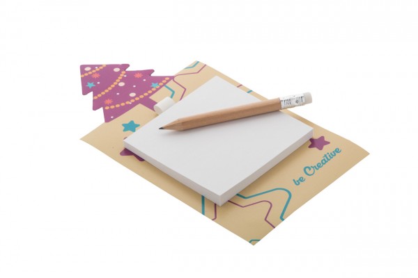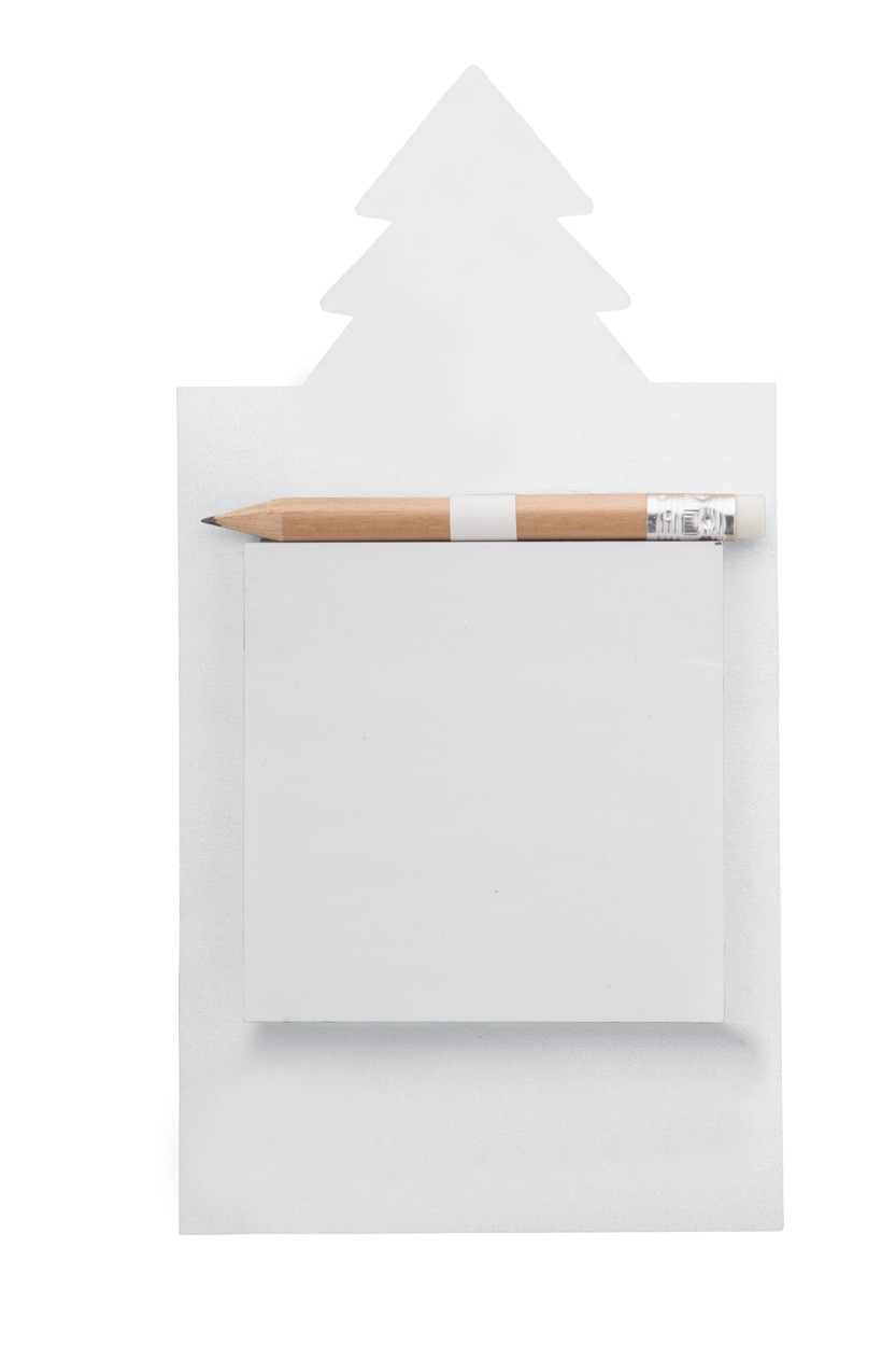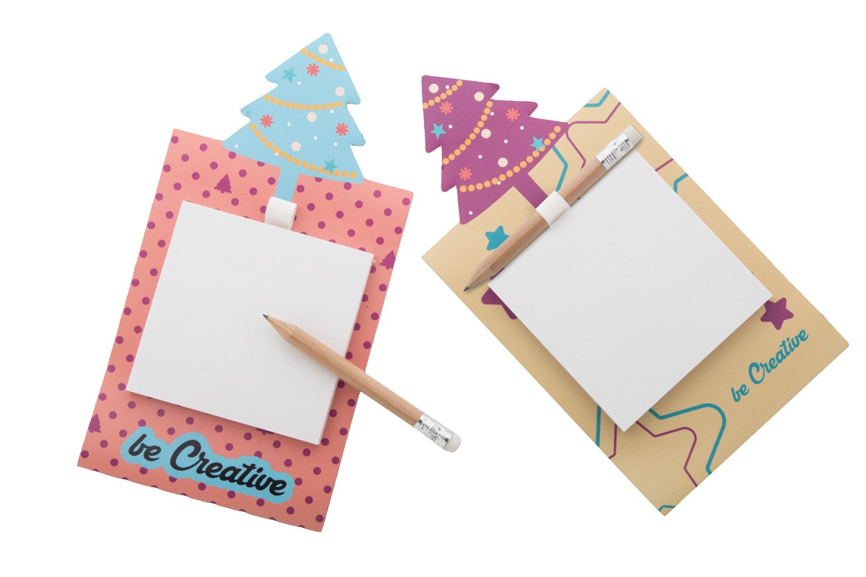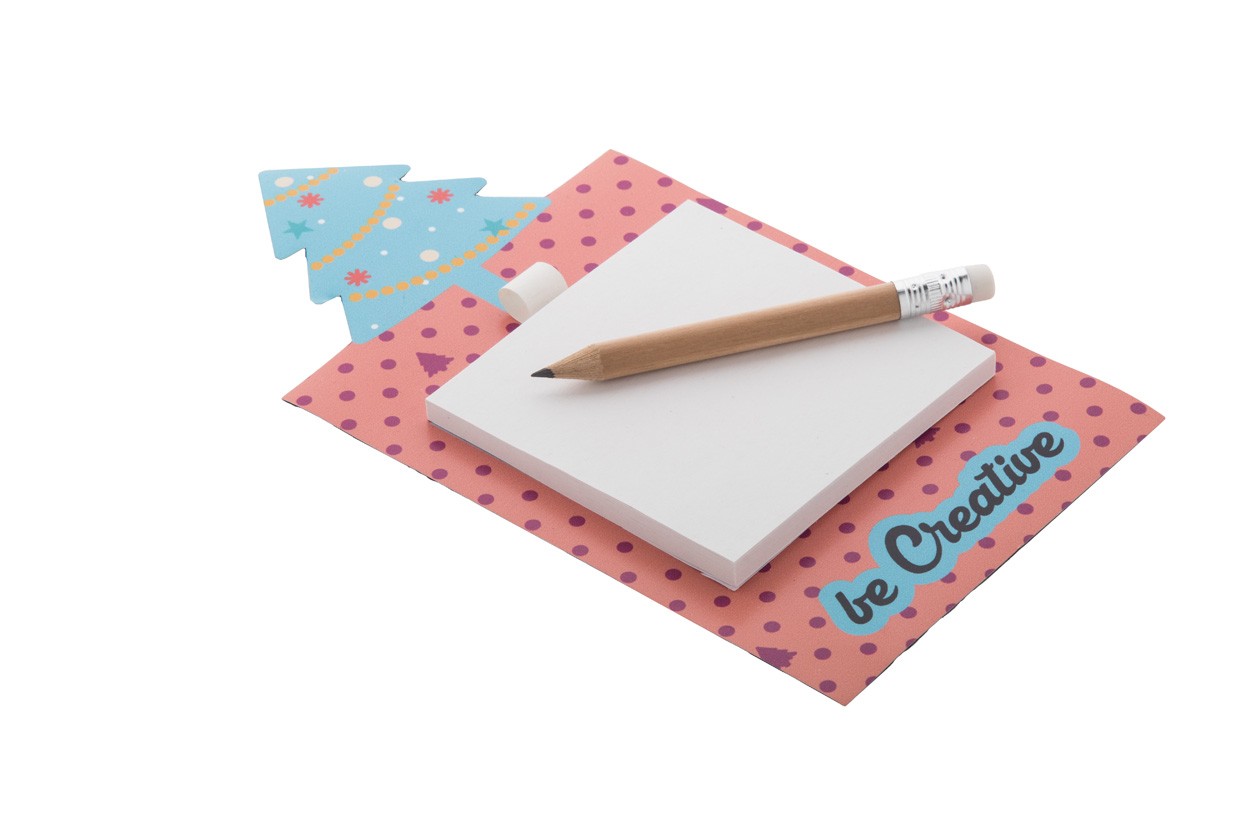 Magnet de frigider, imprimat la comandă, cu decor pentru brad de Crăciun, note auto-adezive și mini creion din lemn. Include 50 de hoi din hârtie reciclată (75×75 mm). MOQ: 100 buc.