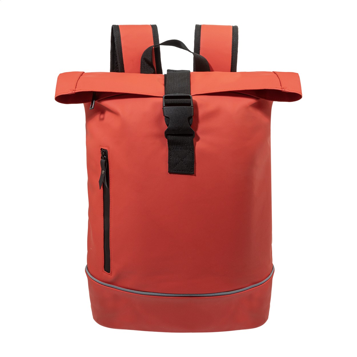 Rucsac impermeabil, moale, din piele PU reciclată, cu compartiment principal cu fermoar și închidere cu cataramă, buzunar frontal cu fermoar impermeabil, compartiment căptușit pentru laptop (15") și bandă reflectorizantă. Cu spate și bretele căptușite. Cu etichetă distinctivă din PU reciclat. Numai pentru uz promoțional, produsul nu se califică drept Echipament de protecție personală.