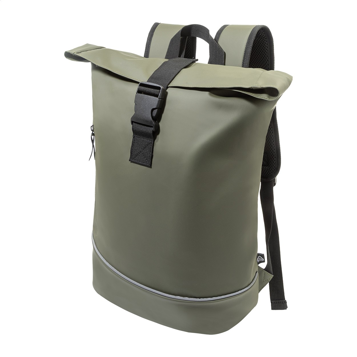 Rucsac impermeabil, moale, din piele PU reciclată, cu compartiment principal cu fermoar și închidere cu cataramă, buzunar frontal cu fermoar impermeabil, compartiment căptușit pentru laptop (15") și bandă reflectorizantă. Cu spate și bretele căptușite. Cu etichetă distinctivă din PU reciclat.