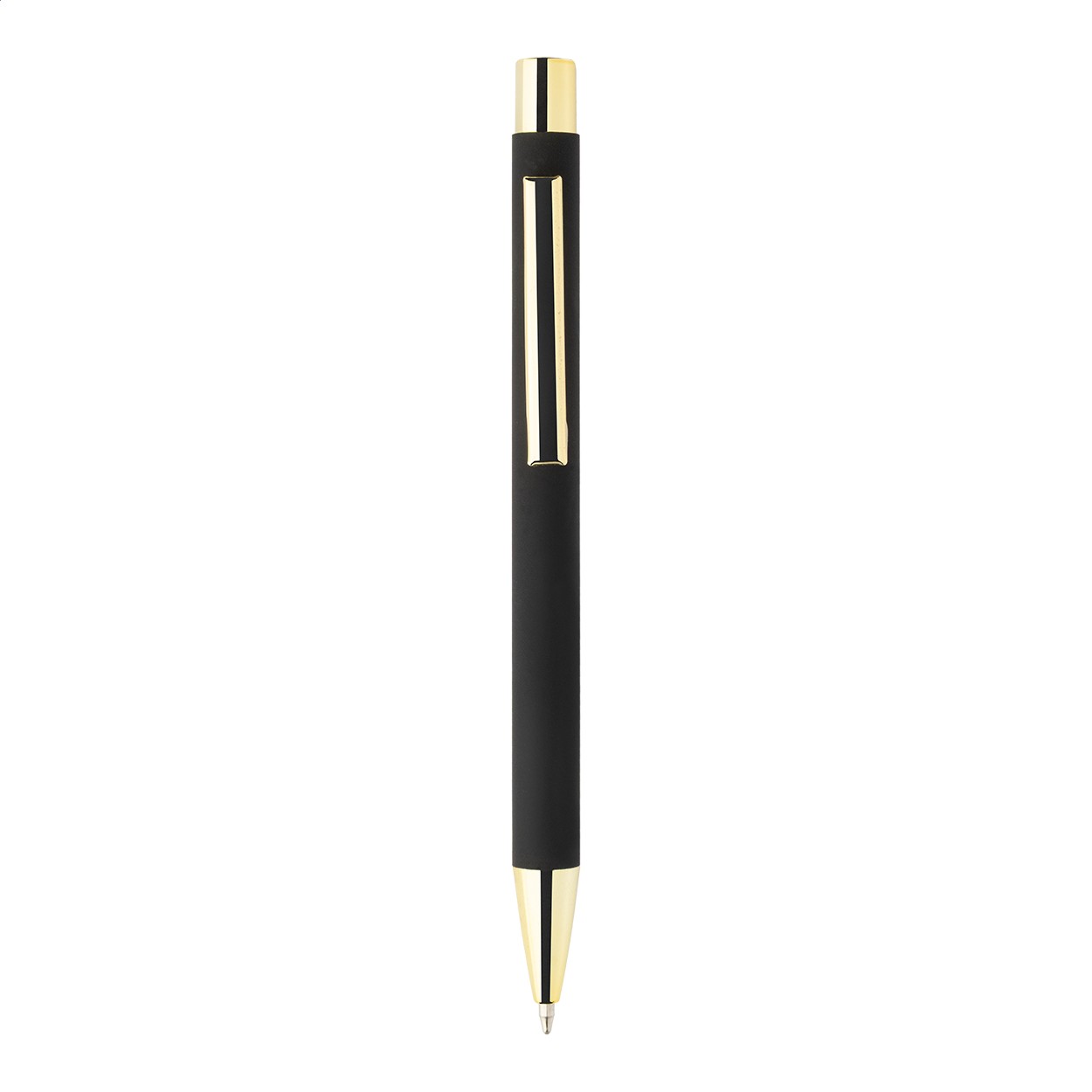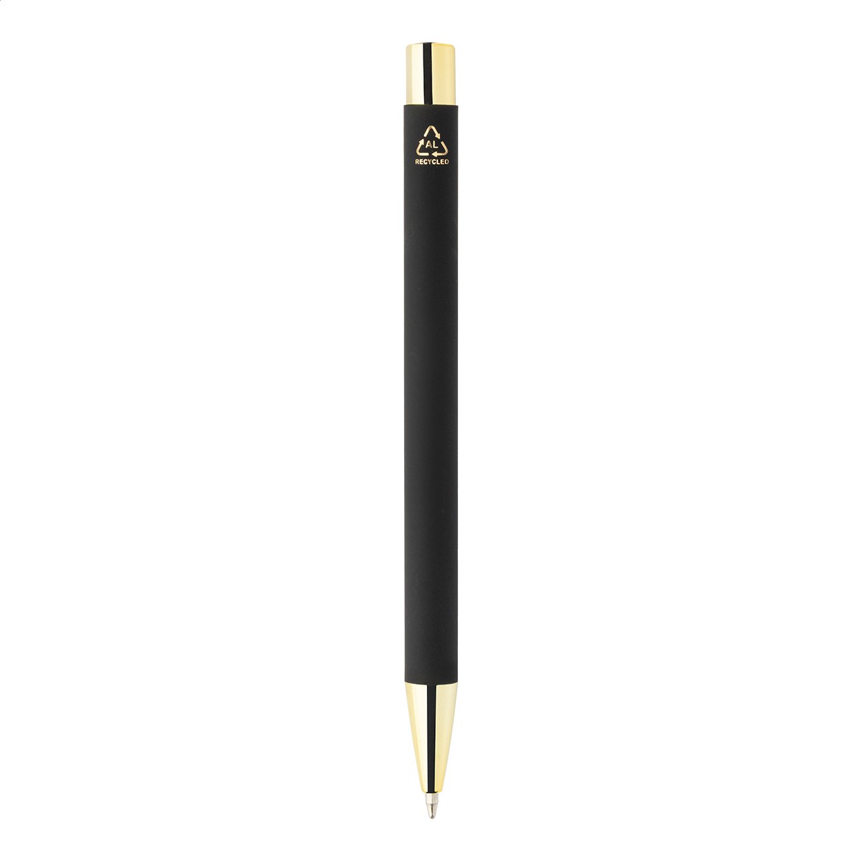 Pix din aluminiu reciclat, cu corp cauciucat negru și părți metalice colorate, cu finisaj lucios. Cu acoperire specială pentru gravură în oglindă, asortată cu părțile metalice. Cu mină albastră.