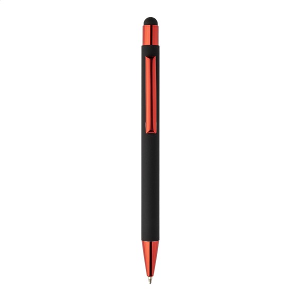 Pix din aluminiu reciclat și stilou cu capăt pentru ecran tactil, cu corp cauciucat negru și părți finisate metalic lucios colorat. Cu acoperire specială pentru gravură oglindă asortată cu părțile metalice. Cu mină albastră.