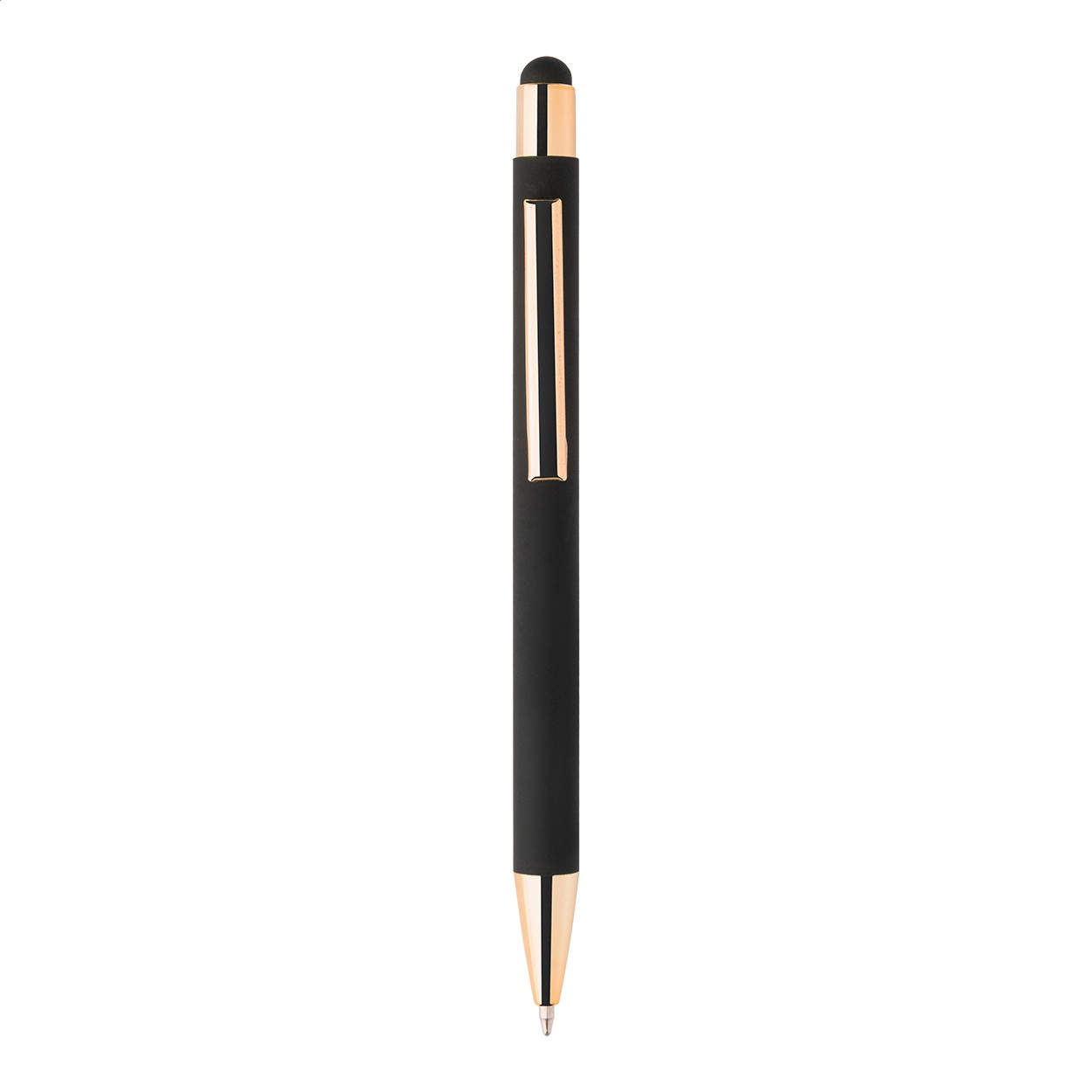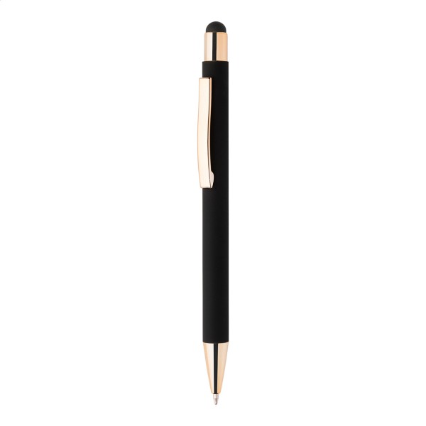 Pix din aluminiu reciclat și stilou cu capăt pentru ecran tactil, cu corp cauciucat negru și părți finisate metalic lucios colorat. Cu acoperire specială pentru gravură oglindă asortată cu părțile metalice. Cu mină albastră.