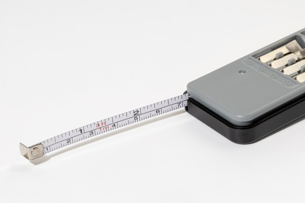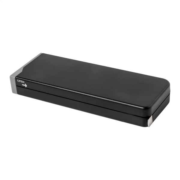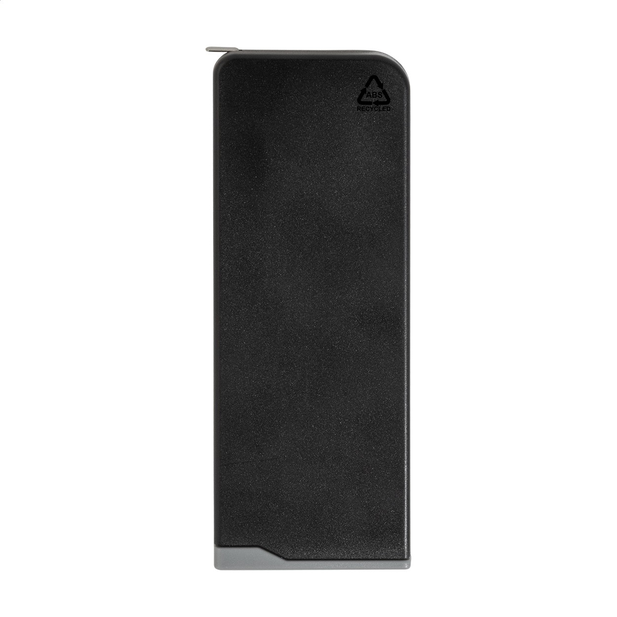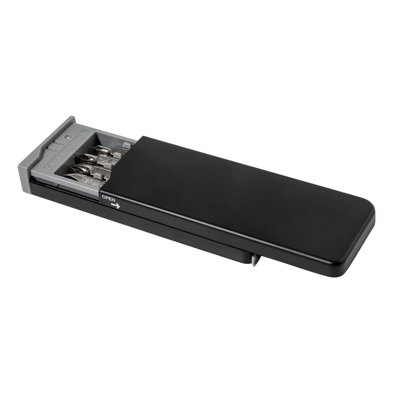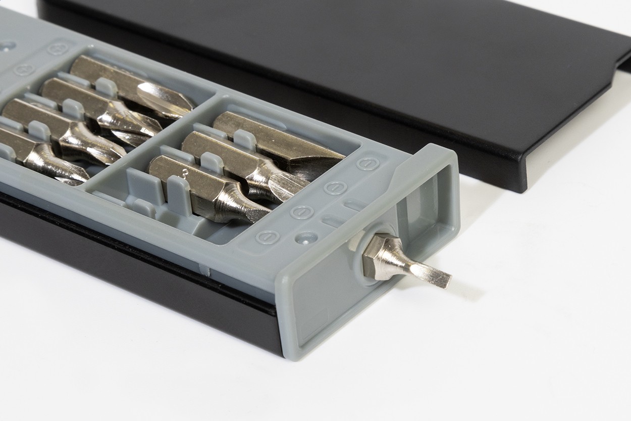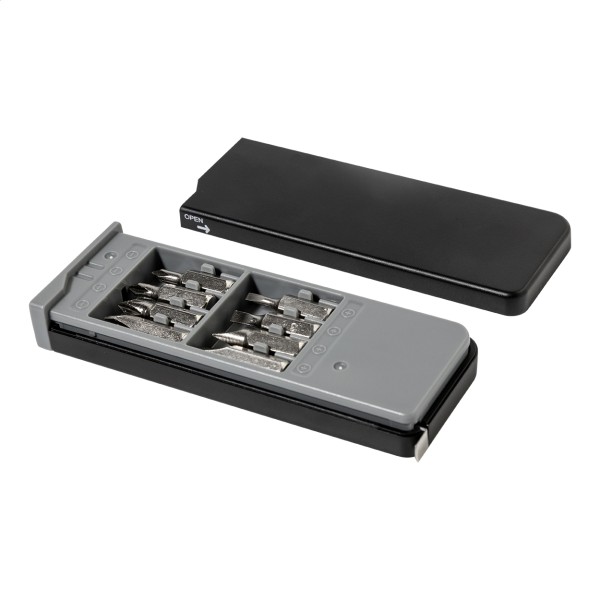 Set compact de scule, în cutie din ABS reciclat, cu 8 biți pentru șurubelniță și ruletă încorporată de 1 m.