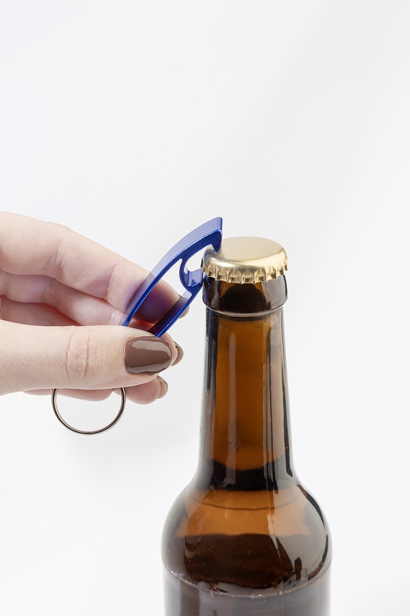 Deschizător de sticle din aluminiu reciclat, cu breloc metalic.