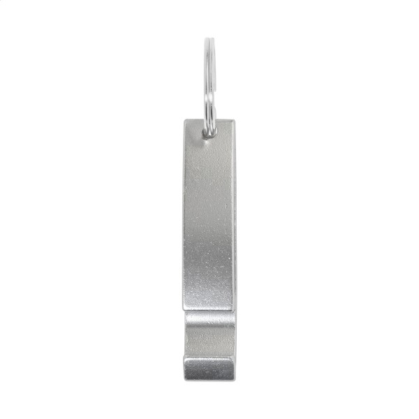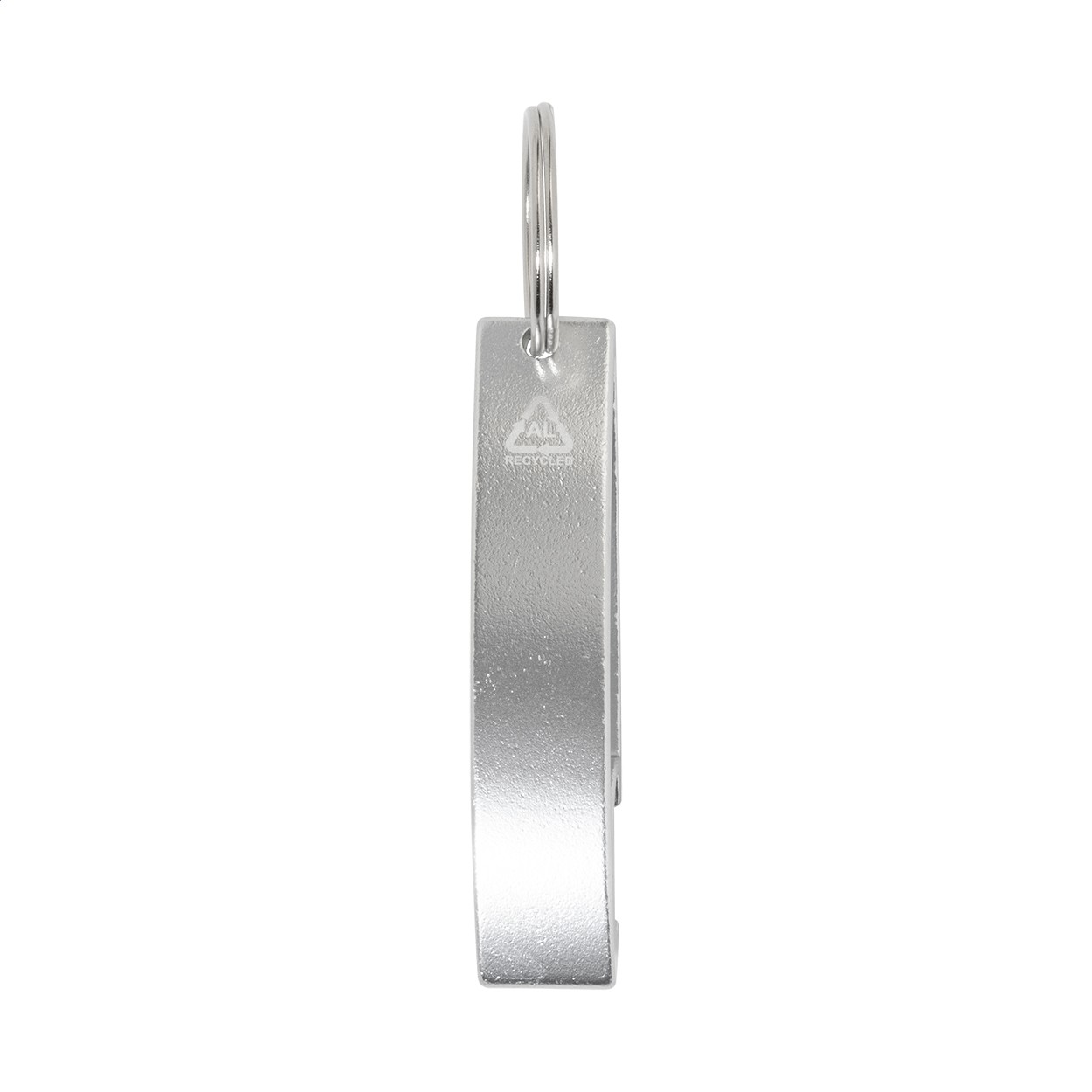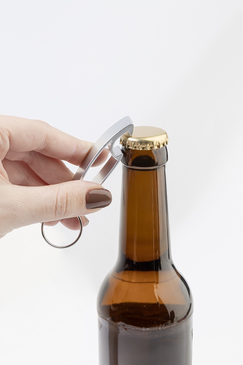 Deschizător de sticle din aluminiu reciclat, cu breloc metalic.