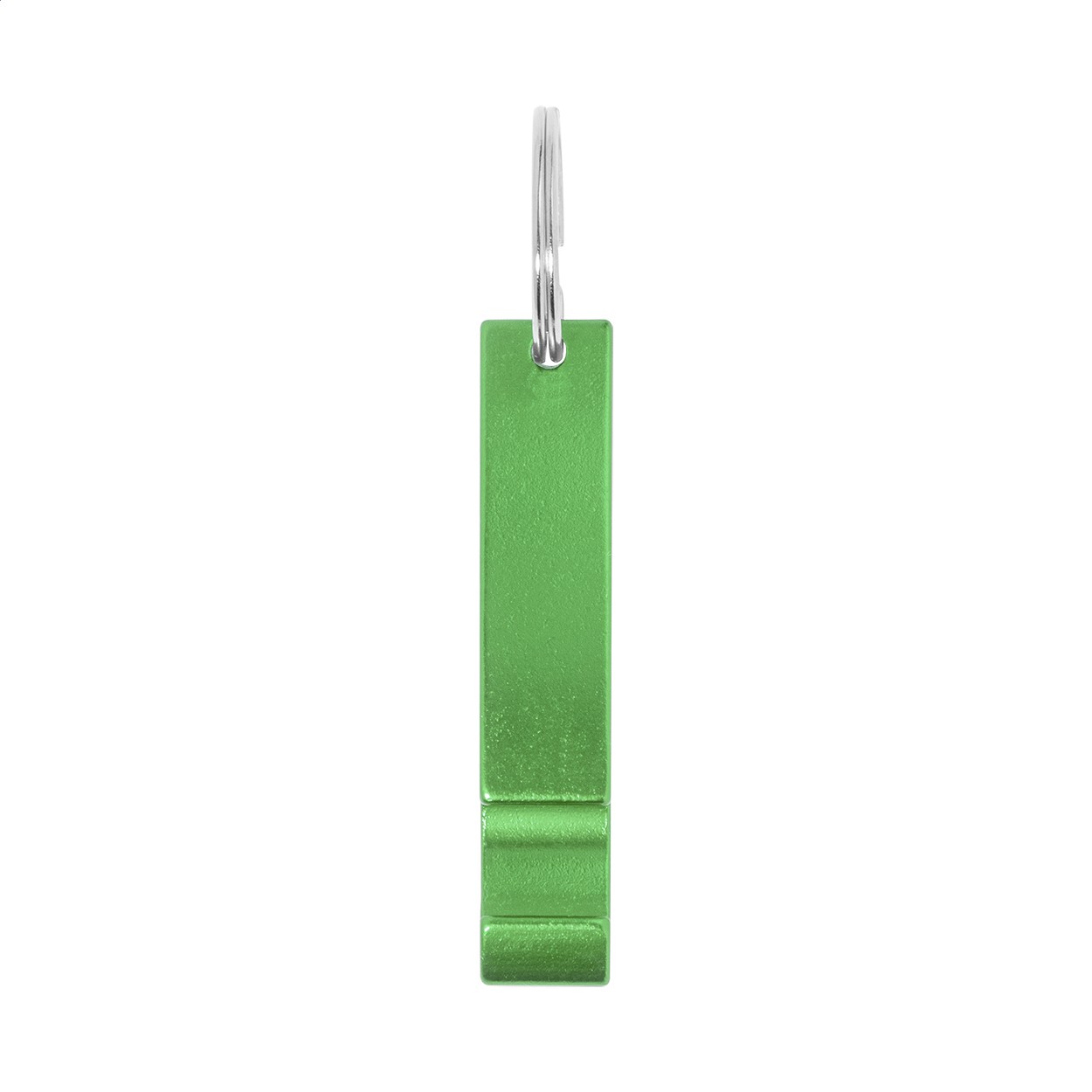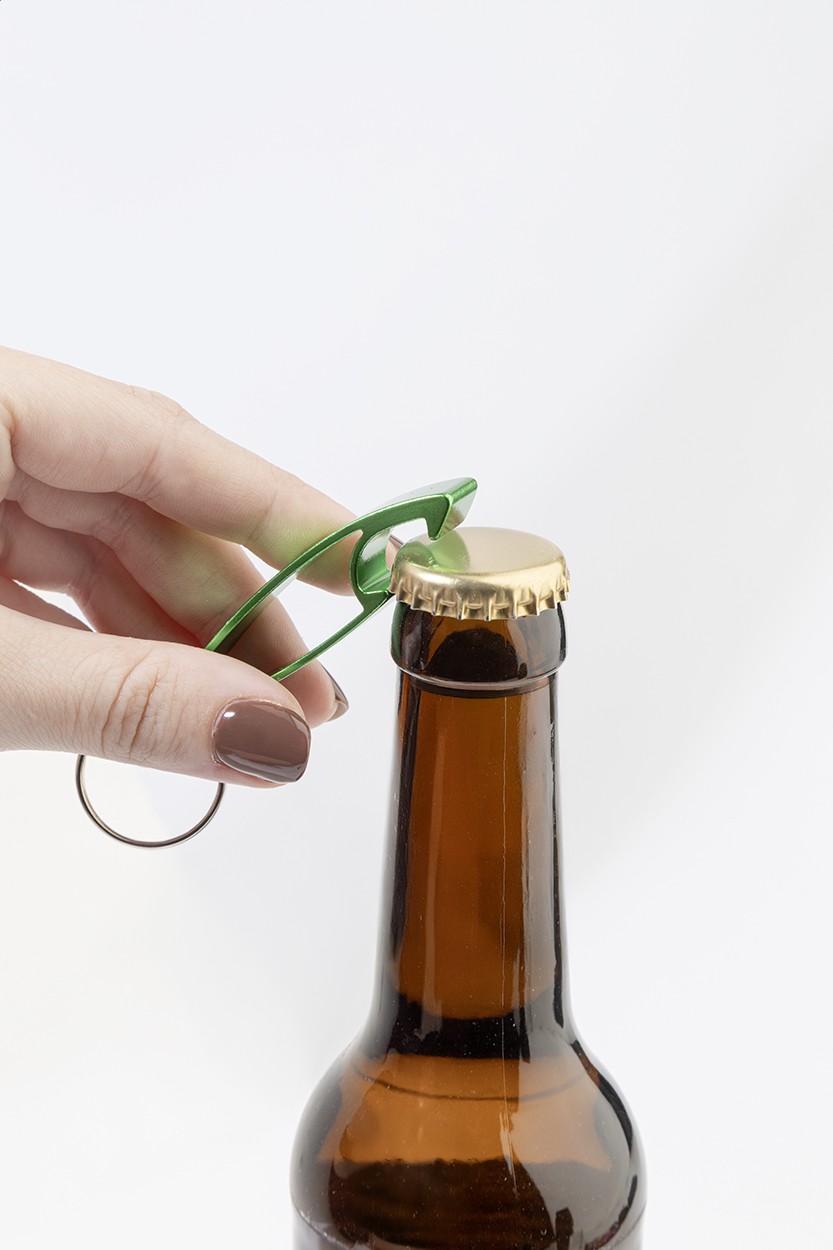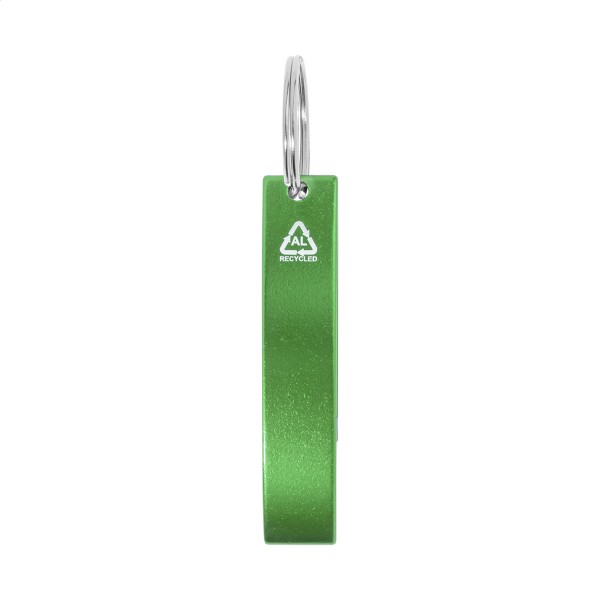 Deschizător de sticle din aluminiu reciclat, cu breloc metalic.