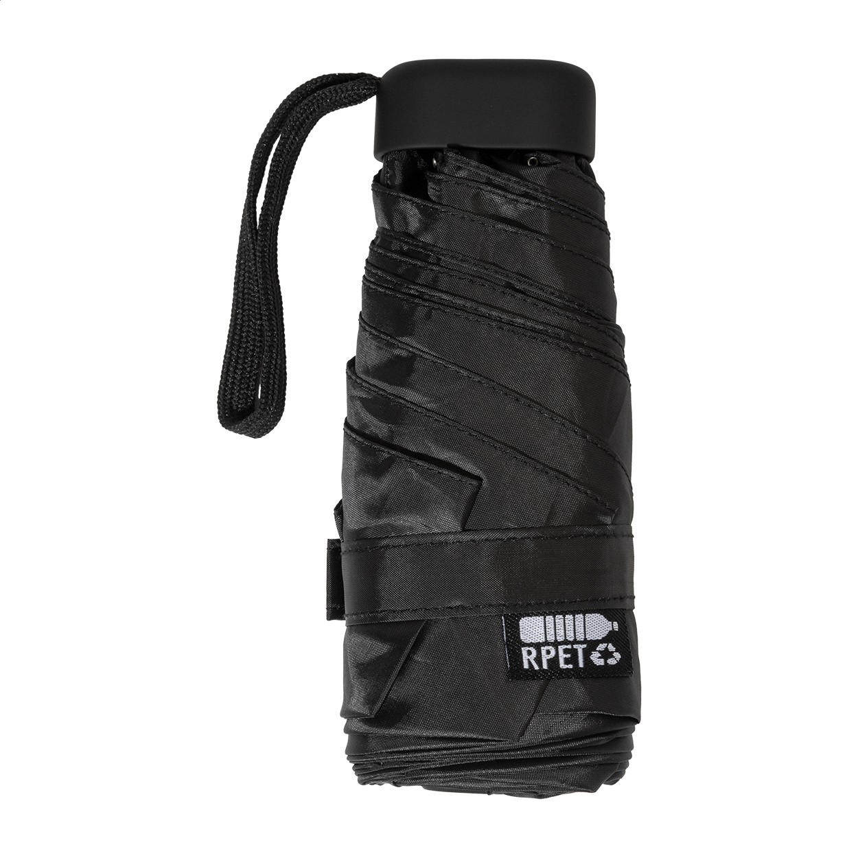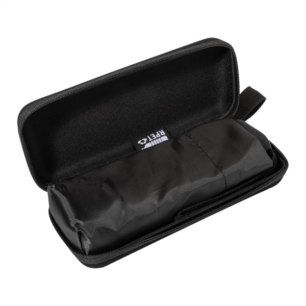 Umbrelă mini, manuală, rezistentă la vânt, cu 3 pliuri și 6 panouri, în husă de culoare asortată și carcasă rigidă EVA cu fermoar. Cu cadru metalic, nervuri din fibră de sticlă și mâner compact cu curea pentru mână. Pongee 190T RPET, cu etichetă RPET distinctivă.