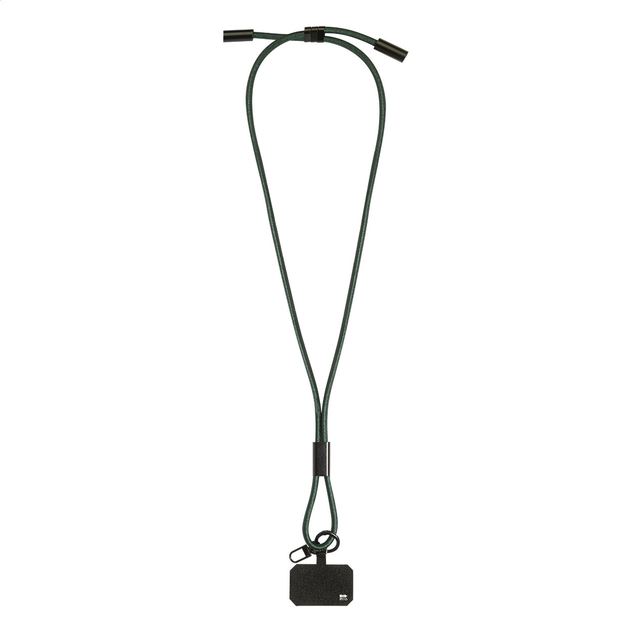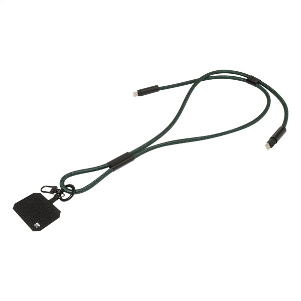 Lanyard suport telefon mobil, RPET, cu inserție pentru telefon, carabină și cablu de încărcare USB-C la USB-C integrat cu conectori ascunși. Suportă încărcare rapidă PD de 60 W și transfer de date.