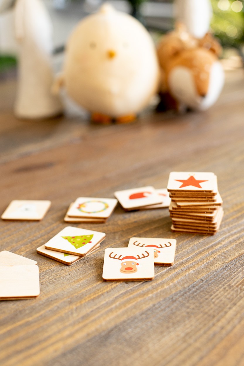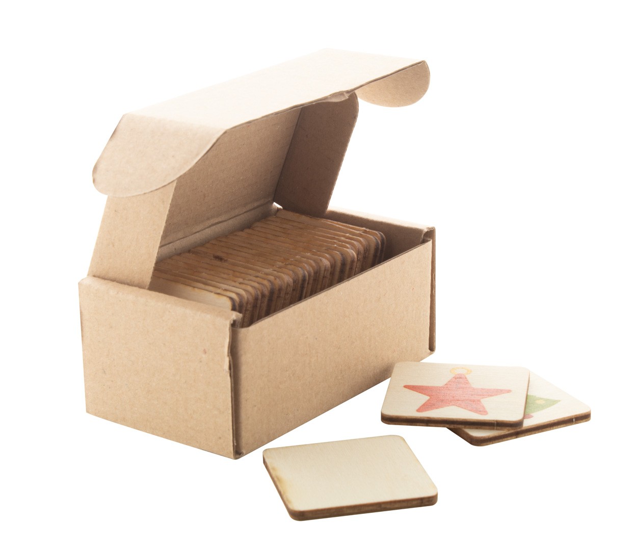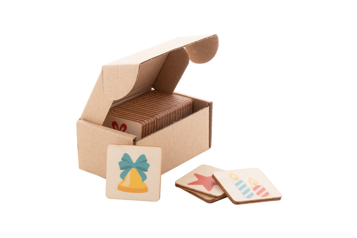 Joc de memorie, din placaj laminat de mesteacăn, cu motive de Crăciun. Cu 24 de plăcuțe (40x40 mm). Prețul include o imprimare identică color a logo-ului pe spatele tuturor plăcuțelor. MOQ: 50 buc.