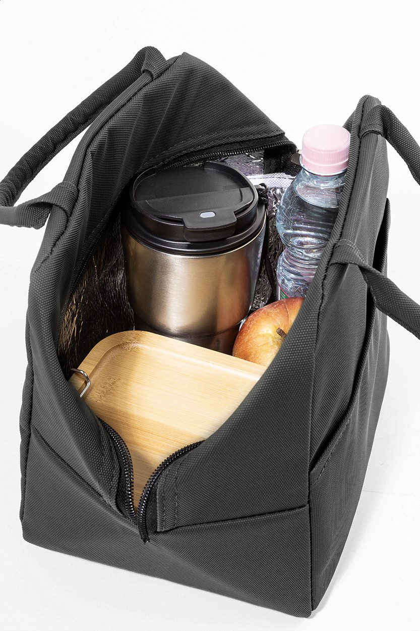 Geantă termoizolantă, din piele PU reciclată, moale, cu fermoar, buzunar frontal și căptușeală din aluminiu. Cu etichetă distinctivă din PU reciclat.