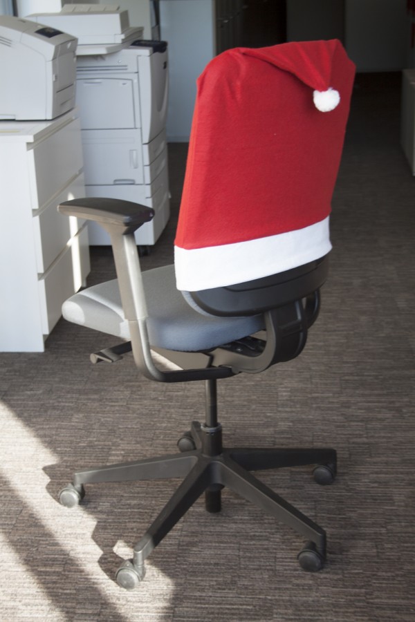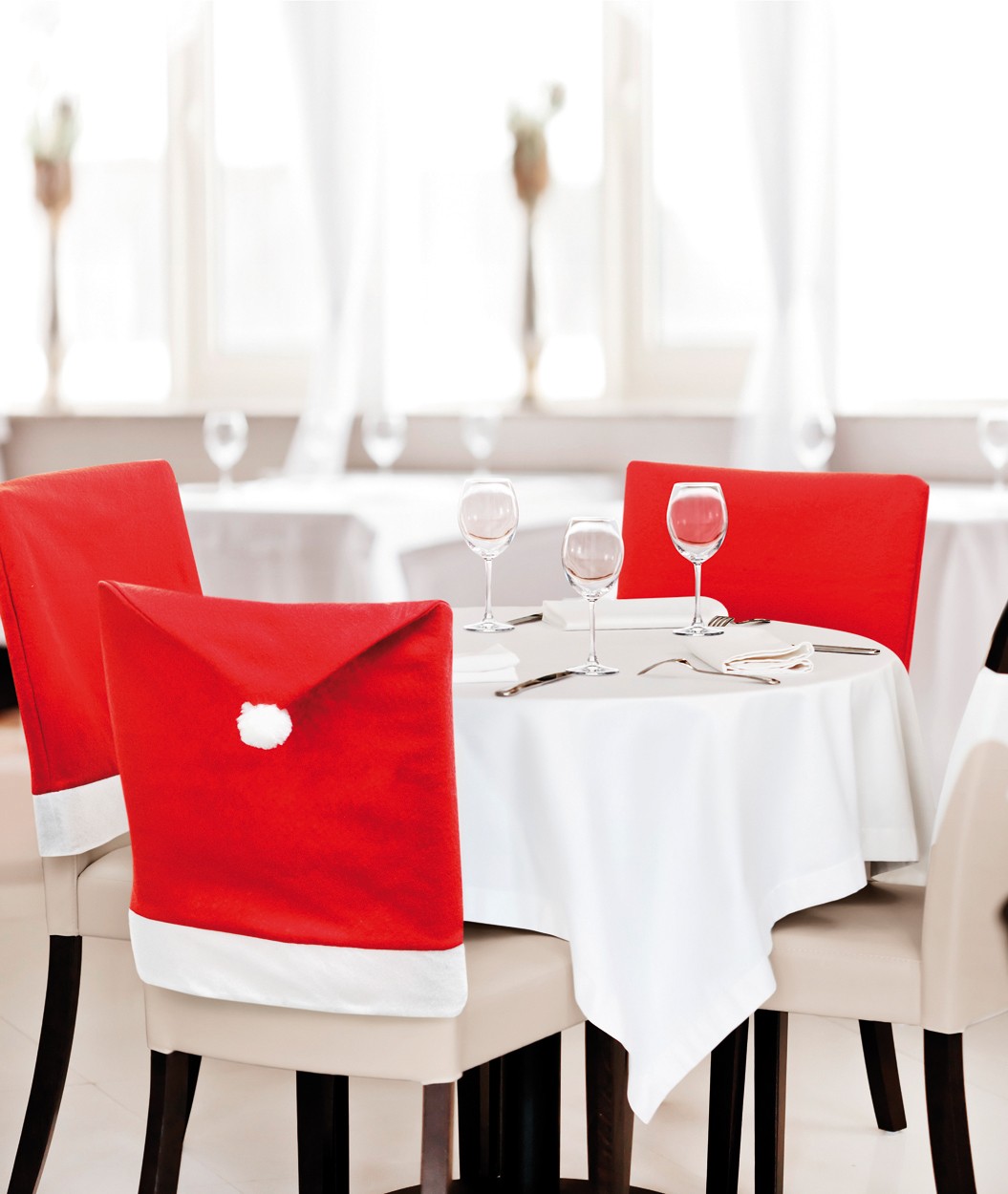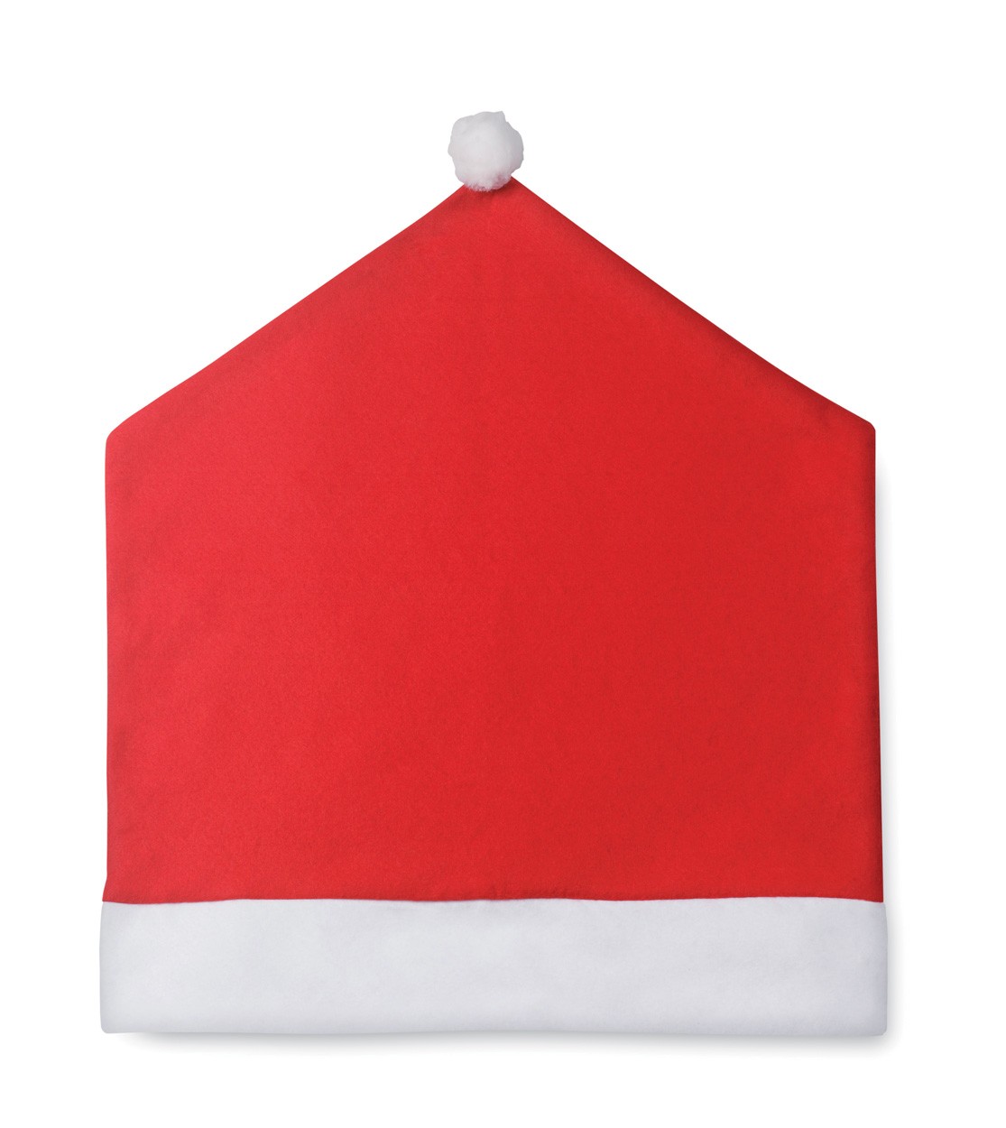 Husă pentru scaun în formă de căciulă Moş Crăciun, din poliester.