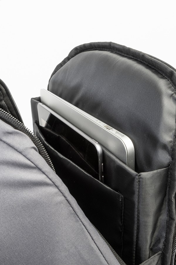 Rucsac antifurt, din RPET, cu compartiment cu fermoar, compartiment căptușit pentru laptop (15„) și tabletă (12”), curea pentru troler, spate și curele pentru umeri căptușite. Cu buzunar antifurt ascuns. Poliester RPET 300D. Cu etichetă RPET distinctivă.