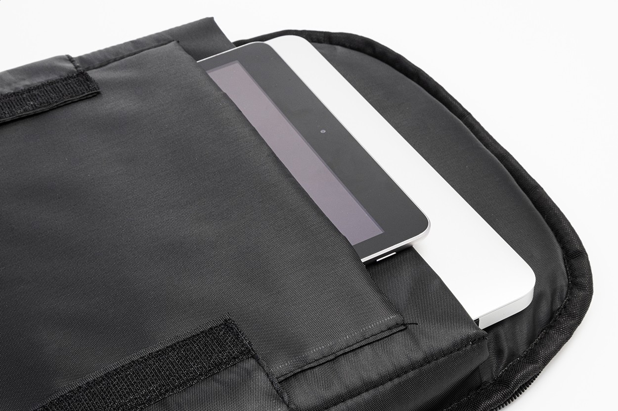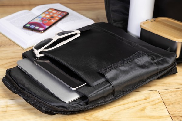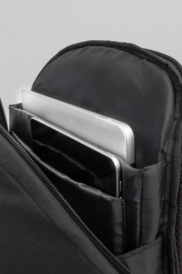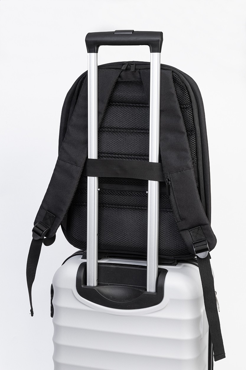 Rucsac antifurt, din RPET, cu compartiment cu fermoar, compartiment căptușit pentru laptop (15„) și tabletă (12”), curea pentru troler, spate și curele pentru umeri căptușite. Cu buzunar antifurt ascuns. Poliester RPET 300D. Cu etichetă RPET distinctivă.