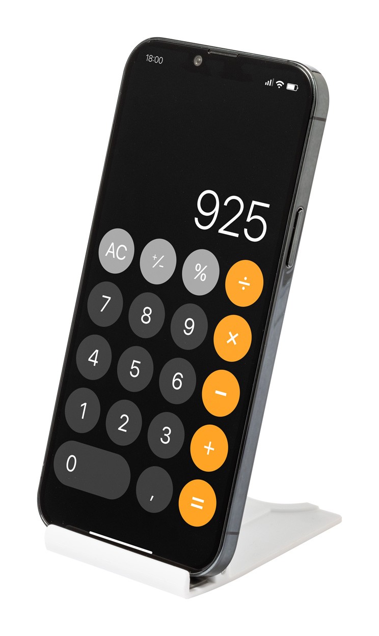Foldable desk mobile holder in ABS plastic.