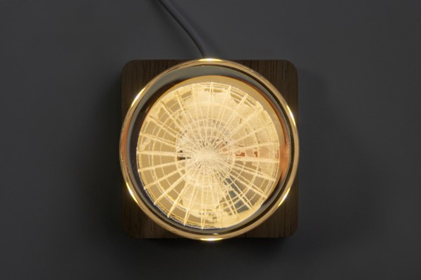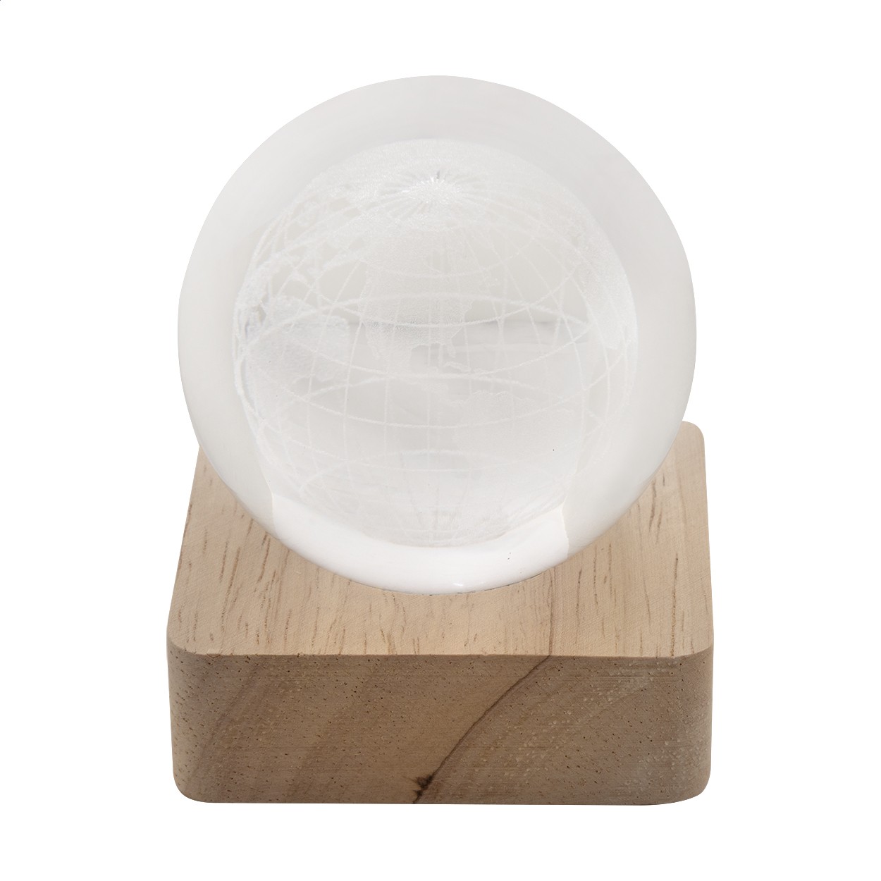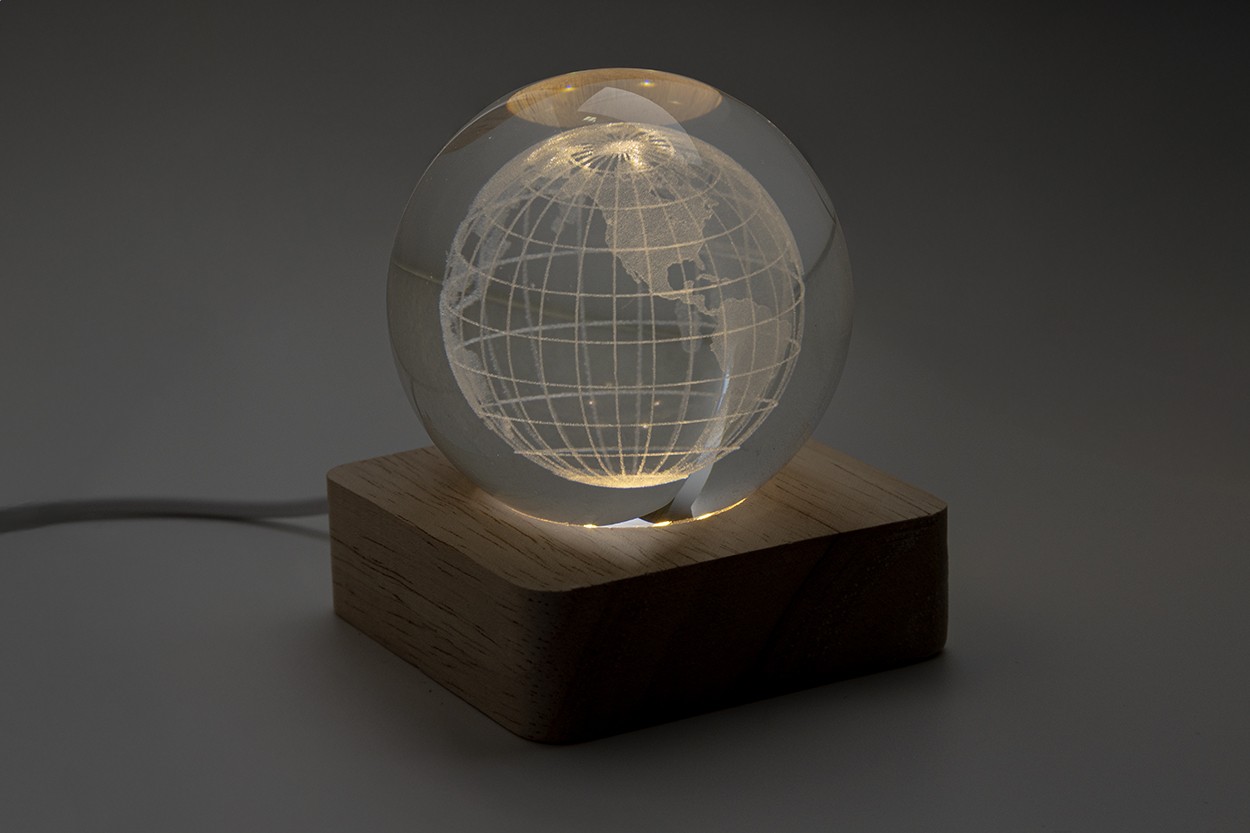 Glob de sticlă, cu bază din lemn, pentru lumină LED. Include cablu de încărcare USB.