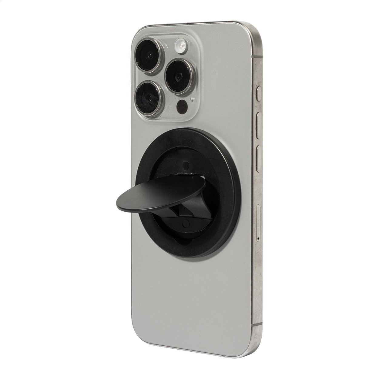 Suport magnetic pentru telefon mobil, din ABS reciclat. Include inel metalic autoadeziv pentru telefoane fără suprafață magnetică.