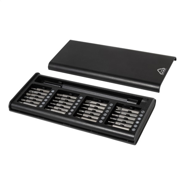 Set de șurubelnițe de precizie, cu 24 de biți, în cutie din ABS reciclat. Mânerul șurubelniței este prevăzut cu un sistem magnetic de fixare a biților, pentru schimbarea rapidă și sigură a acestora.