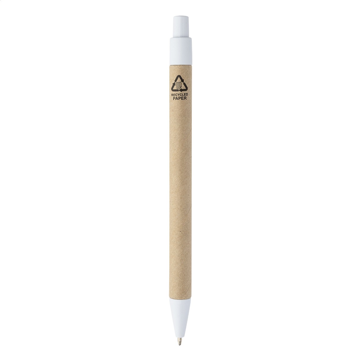 Caiet cu copertă din piele PU reciclată, cu 70 de file dictando, din hârtie reciclată și 125 de marcaje de pagină (în 5 culori diferite). Include hârtie reciclată și pix din PP reciclat cu refill albastru.