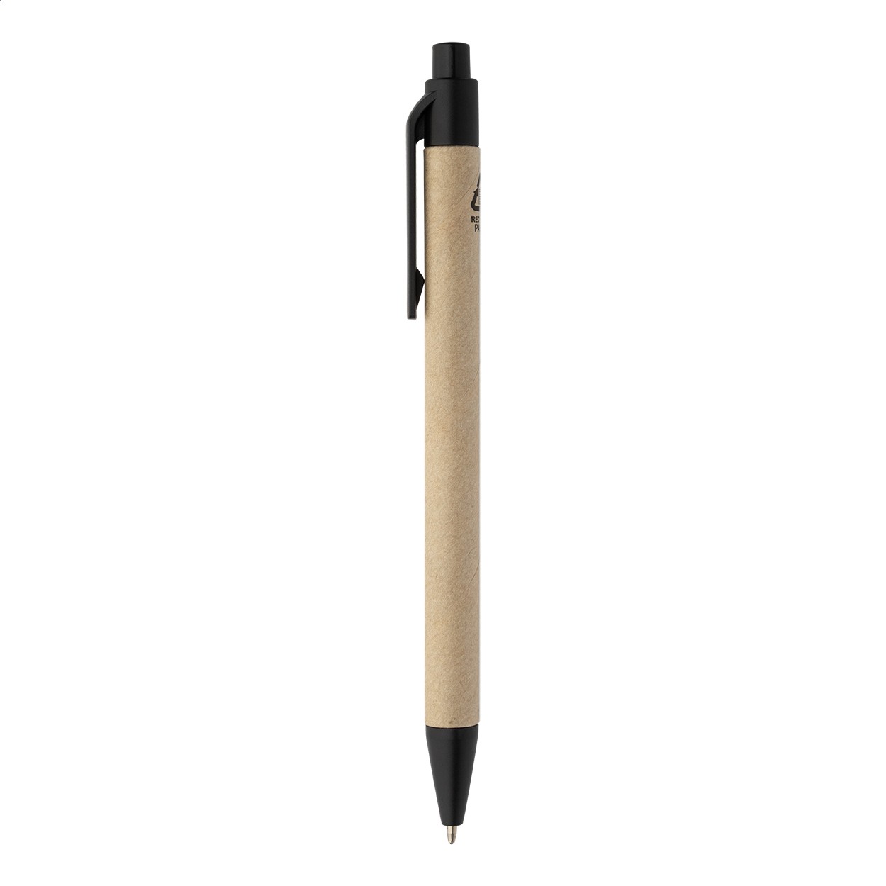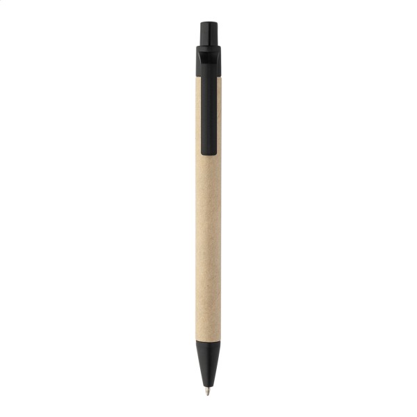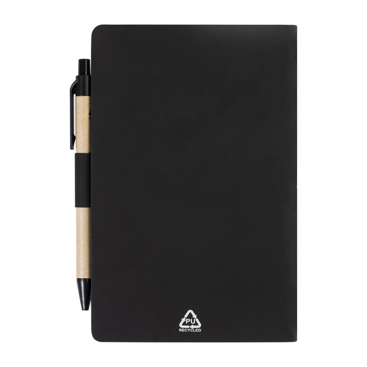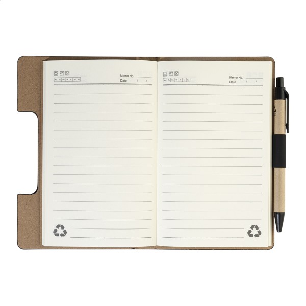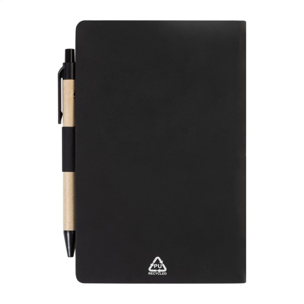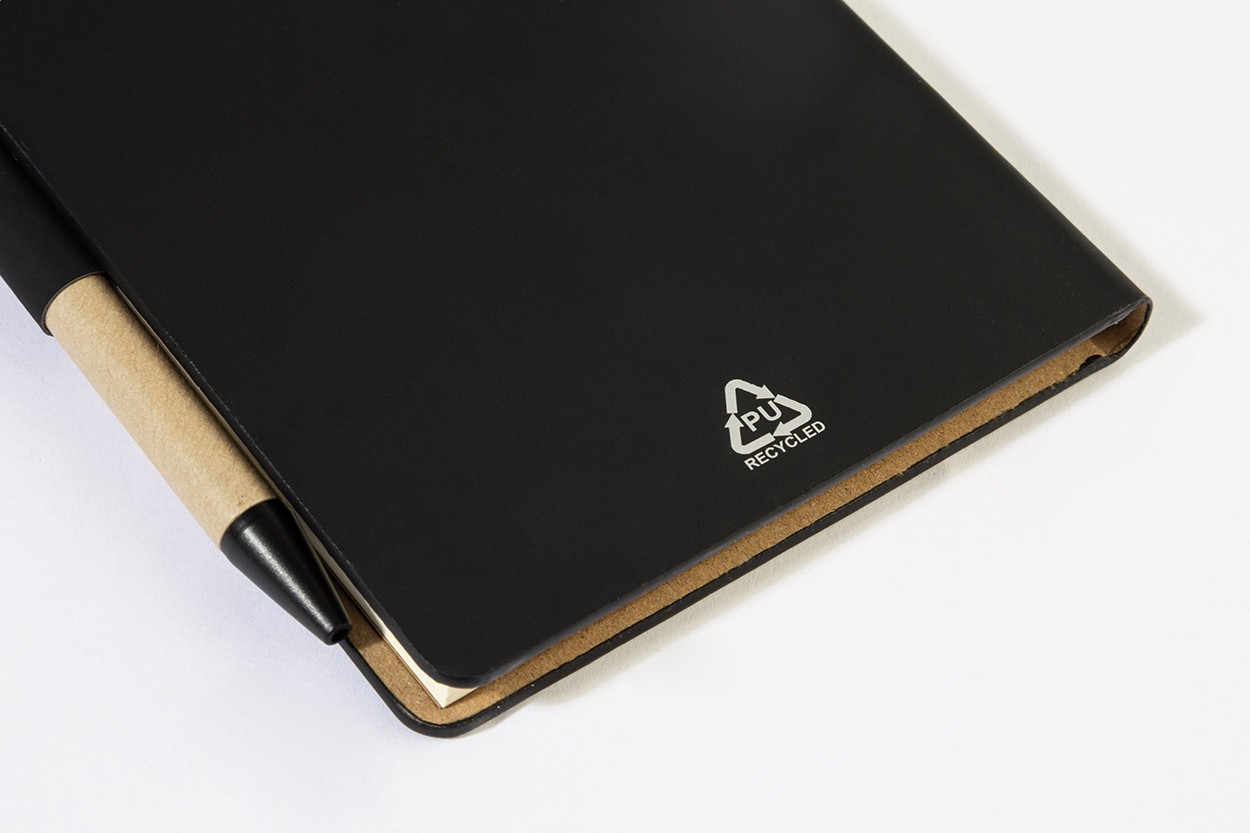 Caiet cu copertă din piele PU reciclată, cu 70 de file dictando, din hârtie reciclată și 125 de marcaje de pagină (în 5 culori diferite). Include hârtie reciclată și pix din PP reciclat cu refill albastru.