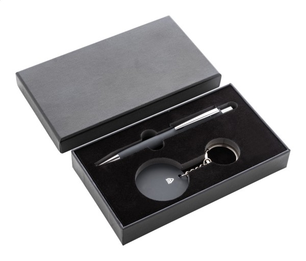 Set cadou din 2 piese, în cutie cadou din hârtie neagră. Include pix din aluminiu reciclat cu finisaj cauciucat și mină albastră și breloc din oțel inoxidabil reciclat cu finisaj cauciucat. Ambele articole au un strat special pentru gravarea cu laser în oglindă.