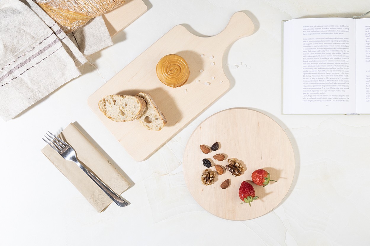Tocător cu mâner, realizat dintr-o singură bucată de lemn natural de arin. 100% natural și complet fără adeziv.