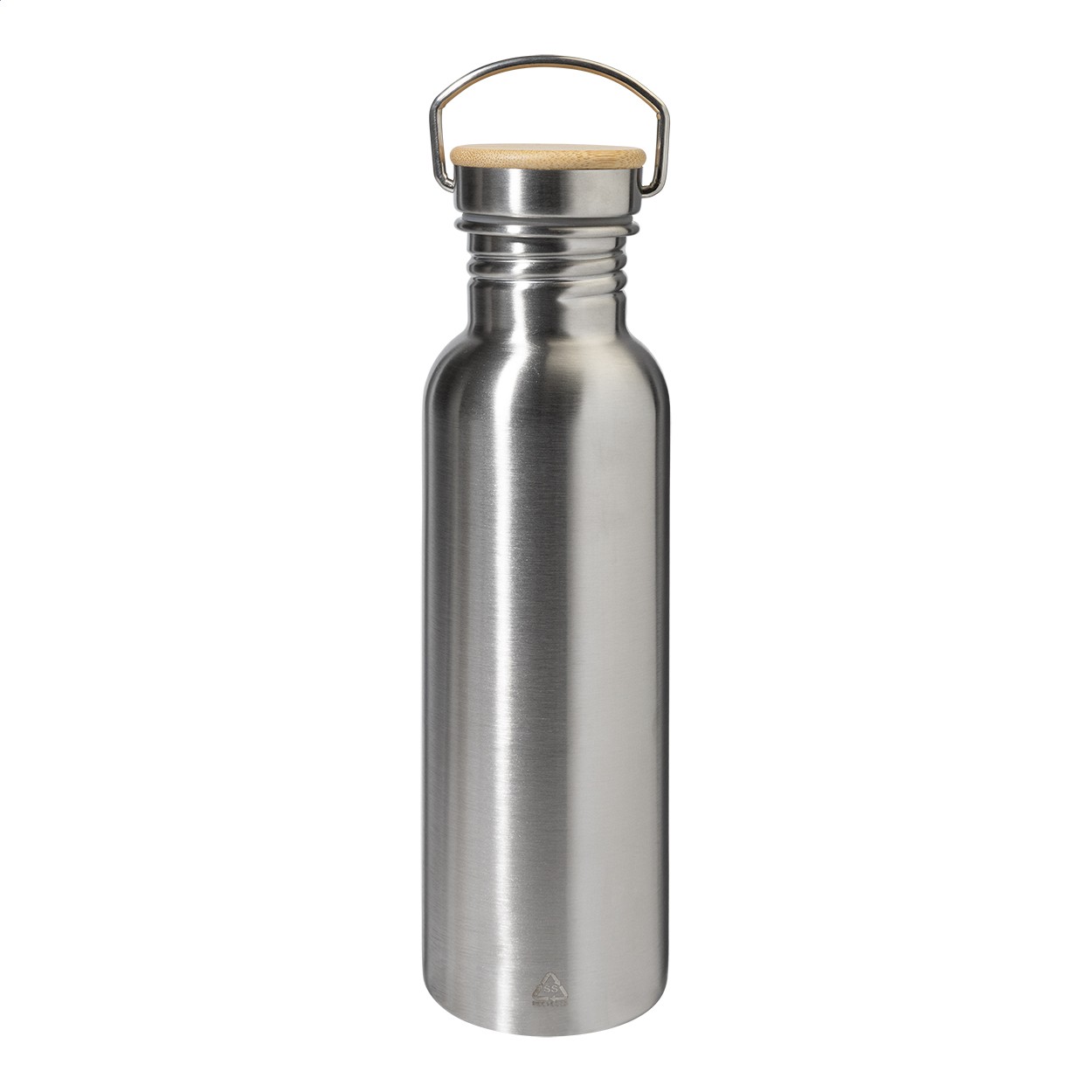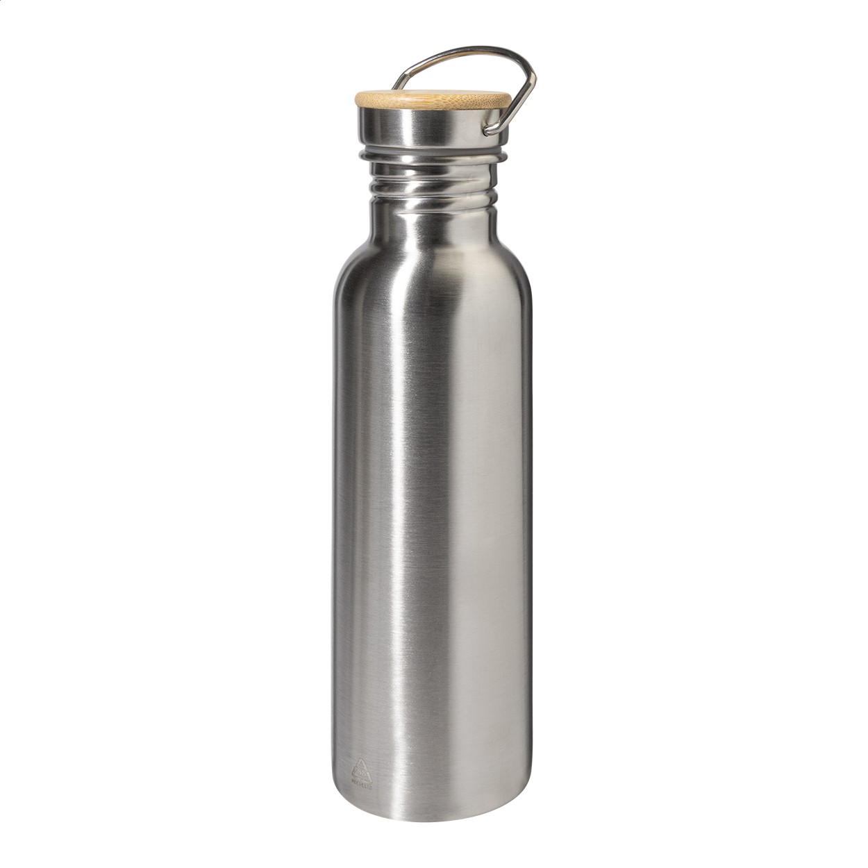 Sticlă din oțel inoxidabil reciclat, cu capac din bambus, 750 ml.