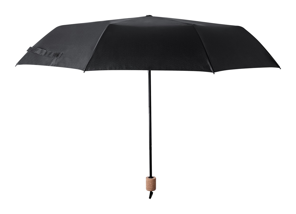 2 pc travel set in black gift box. Including 1 double-wall, recycled stainless steel thermo cup with natural cork base and drinking lid, 1 foldable, manual and windproof umbrella in 190T RPET pongee, with natural cork handle and fiberglass ribs.