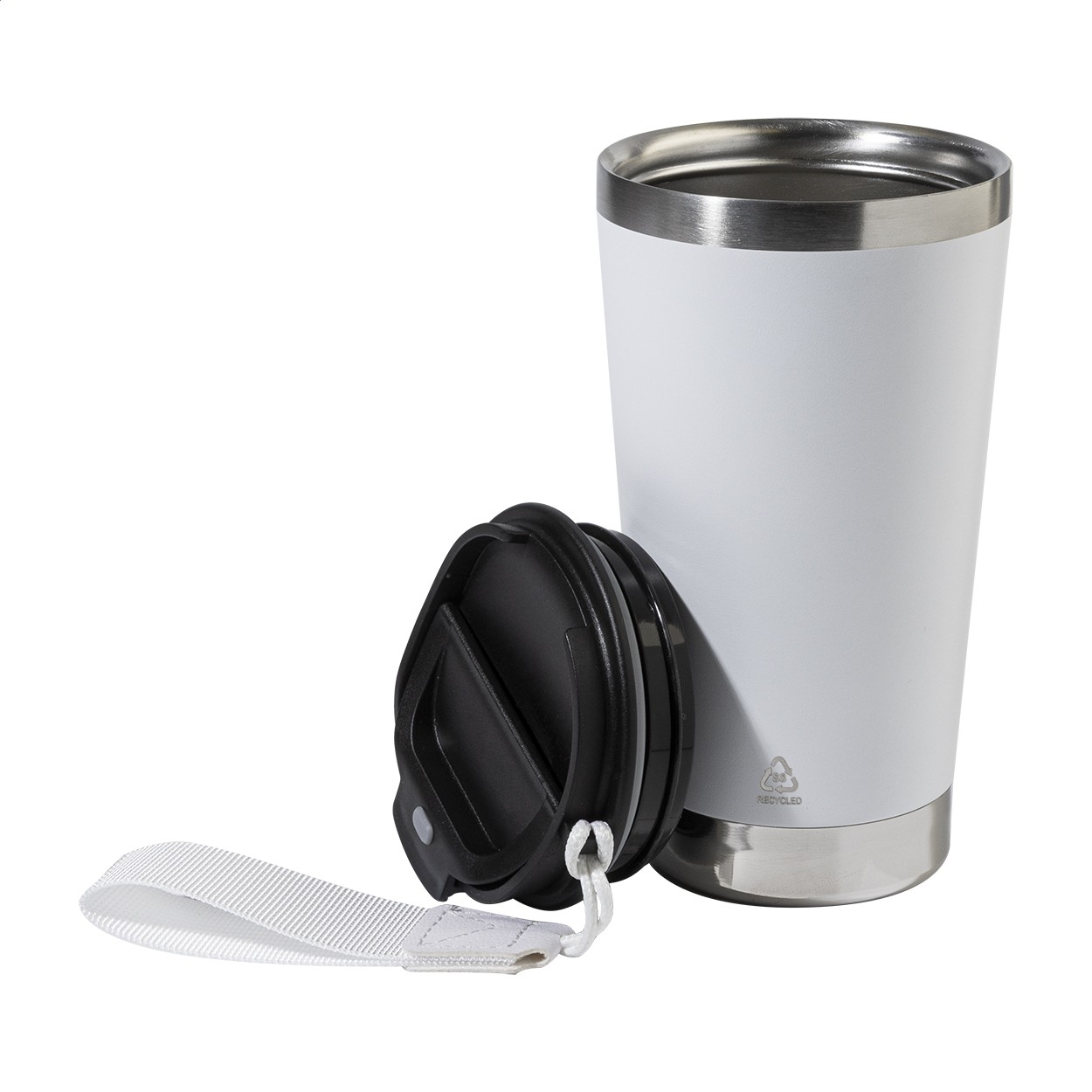 Cană termoizolată, din oțel inoxidabil reciclat, cu perete dublu, cu capac de băut din PP și curea de transport de culoare asortată. 430 ml.
