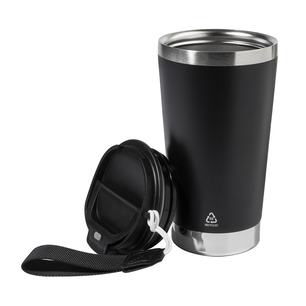 Cană termoizolată, din oțel inoxidabil reciclat, cu perete dublu, cu capac de băut din PP și curea de transport de culoare asortată. 430 ml.