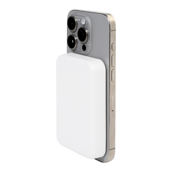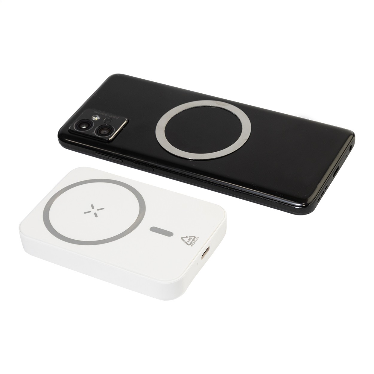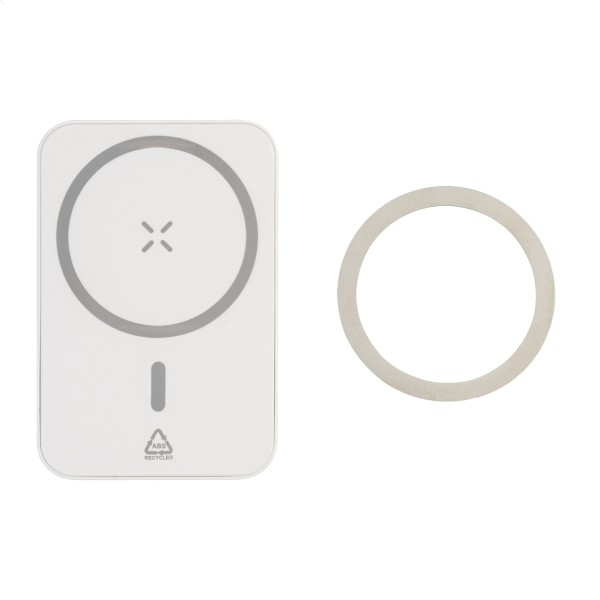 Baterie externă din ABS reciclat, cu baterie de 5000 mAh și încărcător rapid wireless magnetic încorporat (15 W). Cu intrare USB-C și port de încărcare. Include inel metalic autoadeziv pentru a utiliza funcția magnetică pe orice dispozitiv care poate fi încărcat wireless. Compatibil cu iPhone® 12 sau versiuni mai recente. Include cablu de încărcare USB.