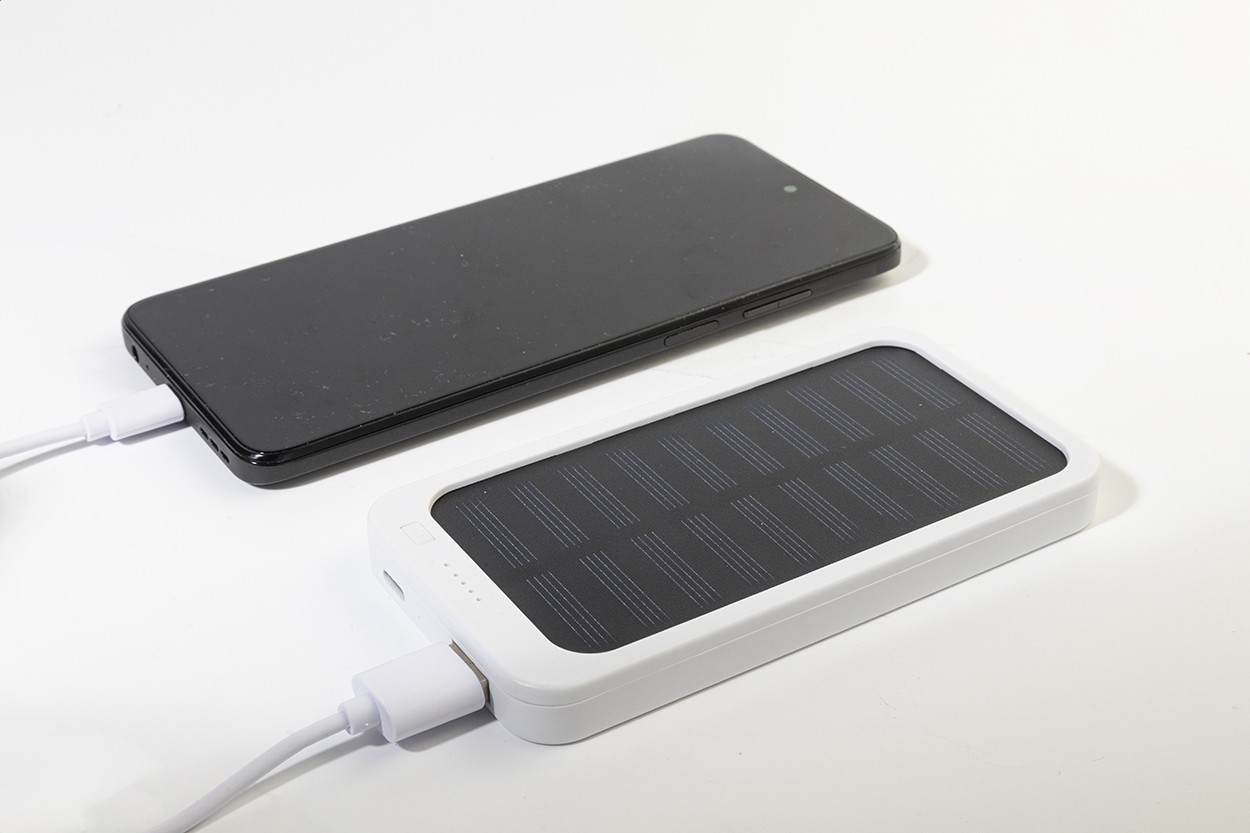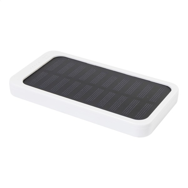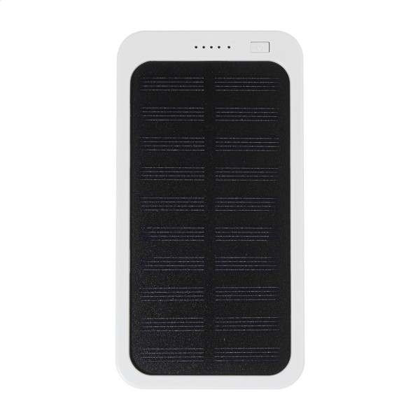 Baterie externă, din ABS reciclat, cu încărcător solar încorporat și baterie de 4000 mAh. Cu 1 port USB și 1 port USB-C pentru încărcare. Port de intrare USB-C. Include cablu de încărcare USB.