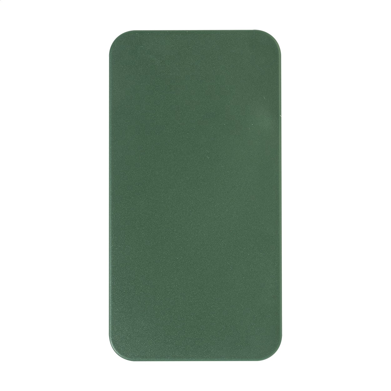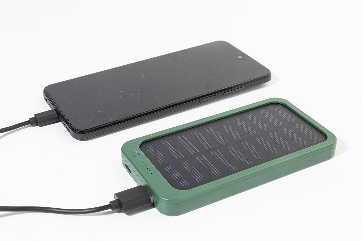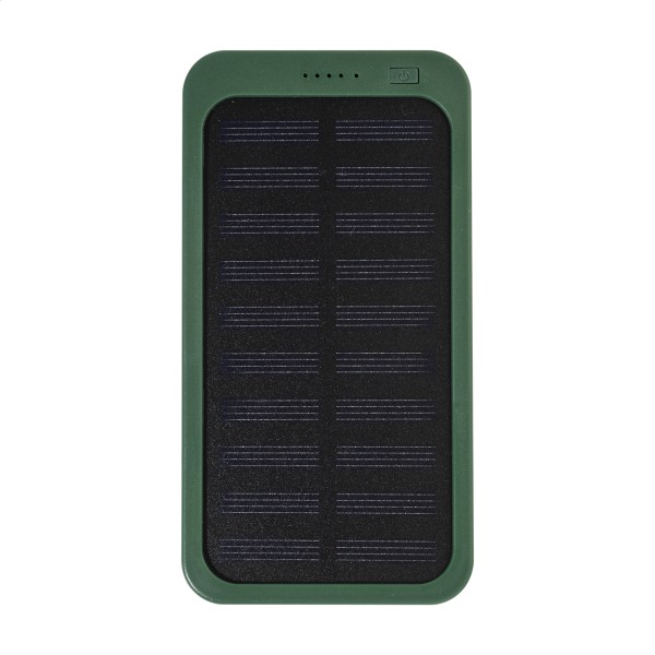 Baterie externă, din ABS reciclat, cu încărcător solar încorporat și baterie de 4000 mAh. Cu 1 port USB și 1 port USB-C pentru încărcare. Port de intrare USB-C. Include cablu de încărcare USB.