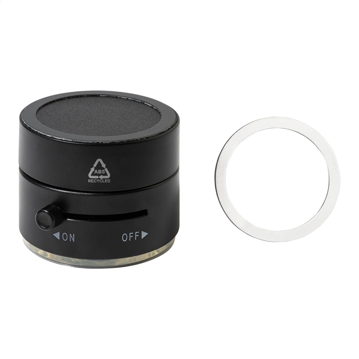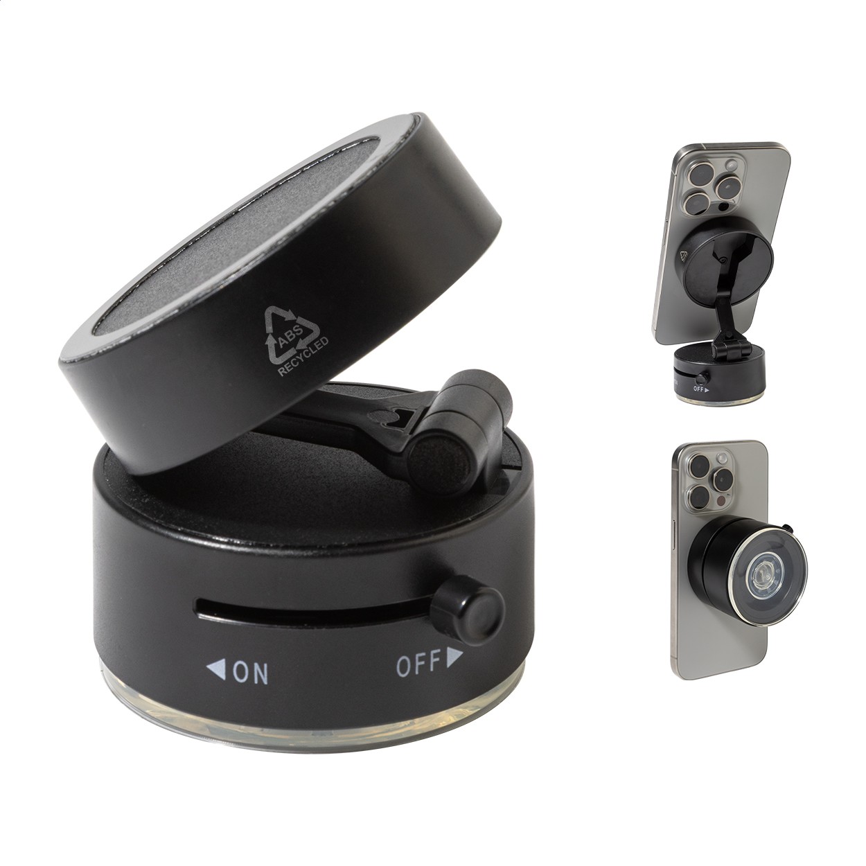 Suport magnetic pentru telefonul mobil, din ABS reciclat, cu fixare prin ventuză. Include inel metalic autoadeziv pentru telefoane fără suprafață magnetică.