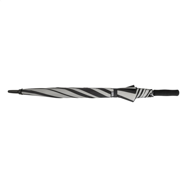 Umbrelă manuală, rezistentă la vânt, de dimensiuni mari, cu 4 panouri din pongee RPET 190T și 4 panouri din țesătură reflectorizantă. Cu cadru și ax complet din fibră de sticlă, mâner din EVA. Pongee RPET 190T. Cu etichetă RPET distinctivă.
