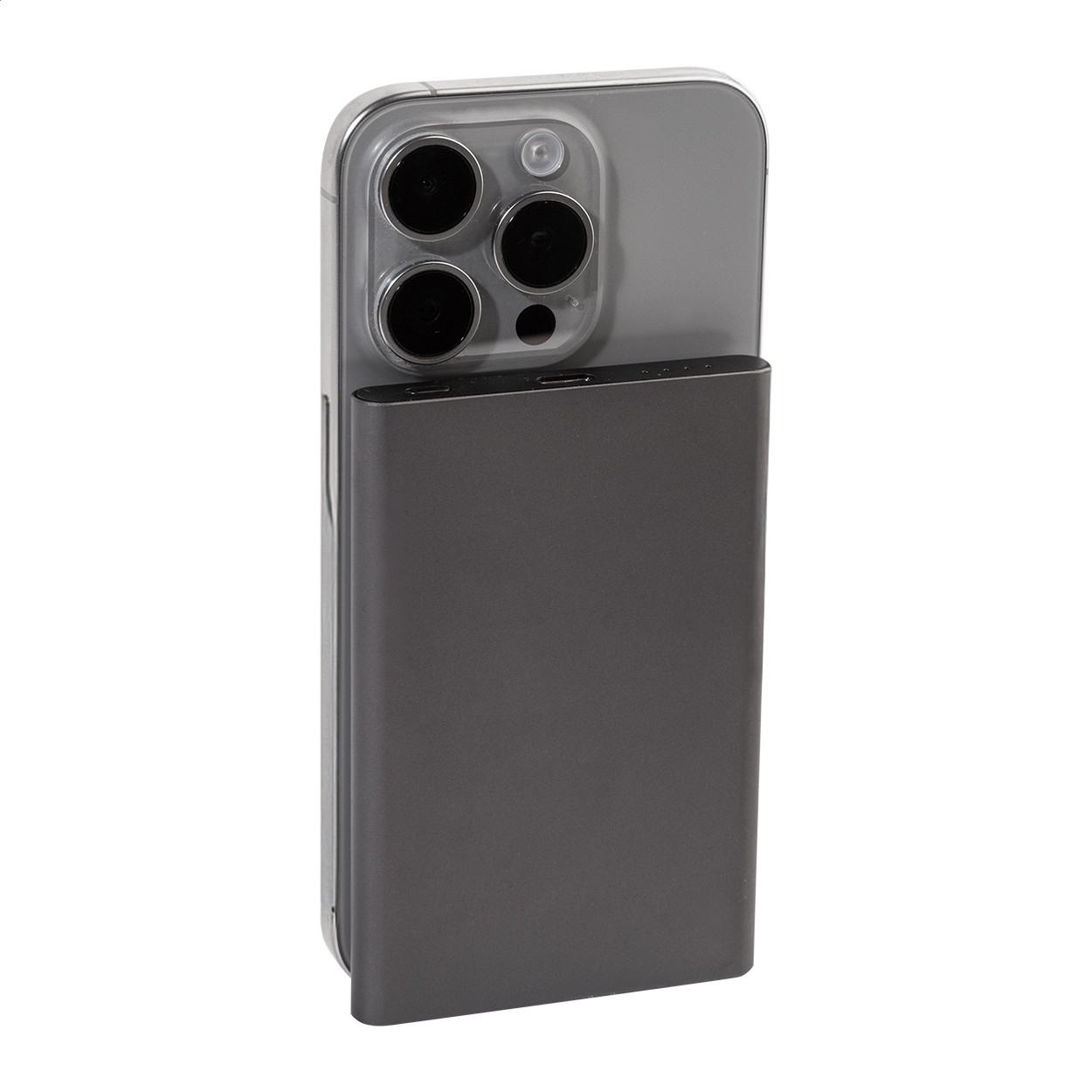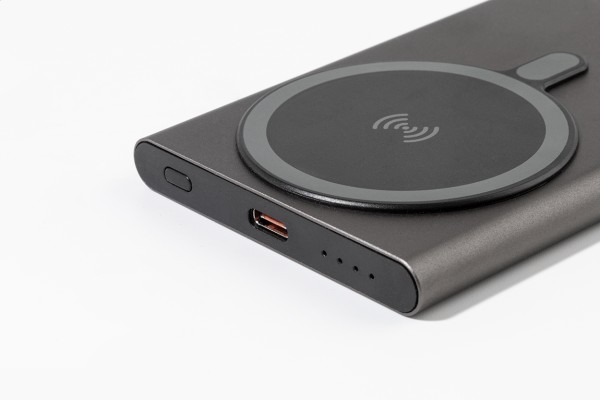 Baterie externă din aluminiu reciclat, cu încărcător rapid wireless magnetic încorporat (15 W) și baterie de 5000 mAh. Cu intrare USB-C și port pentru încărcător. Include inel metalic autoadeziv pentru a utiliza funcția magnetică pe orice dispozitiv wirless. Compatibil cu iPhone® 12 sau mai nou. Inclusiv cablu de încărcare USB.
