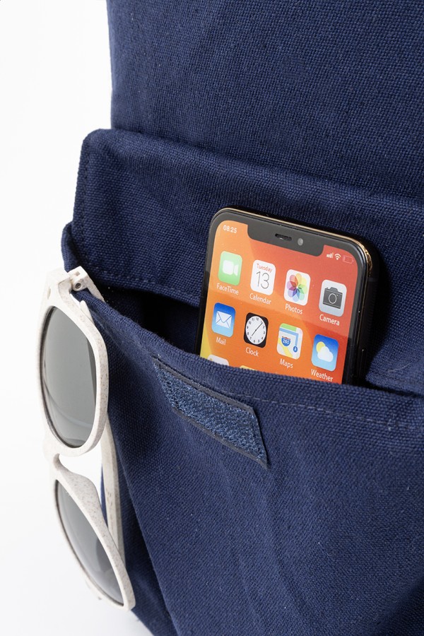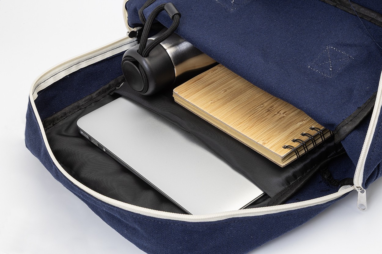 Rucsac din pânză reciclată, cu compartiment principal cu fermoar, compartiment căptușit pentru laptop (13") și buzunar frontal cu închidere cu velcro. 70% bumbac reciclat și 30% poliester RPET. Cu etichetă distinctivă din bumbac reciclat.
