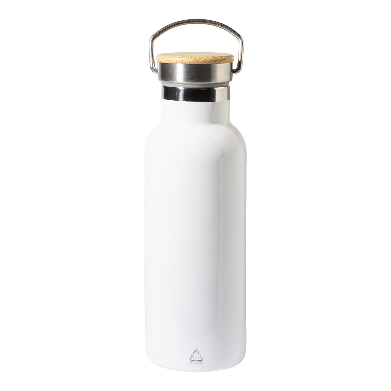 Sticlă cu pereți dubli, din oțel inoxidabil reciclat, izolată termic, pentru imprimare prin sublimare, cu capac de transport din bambus. 500 ml.