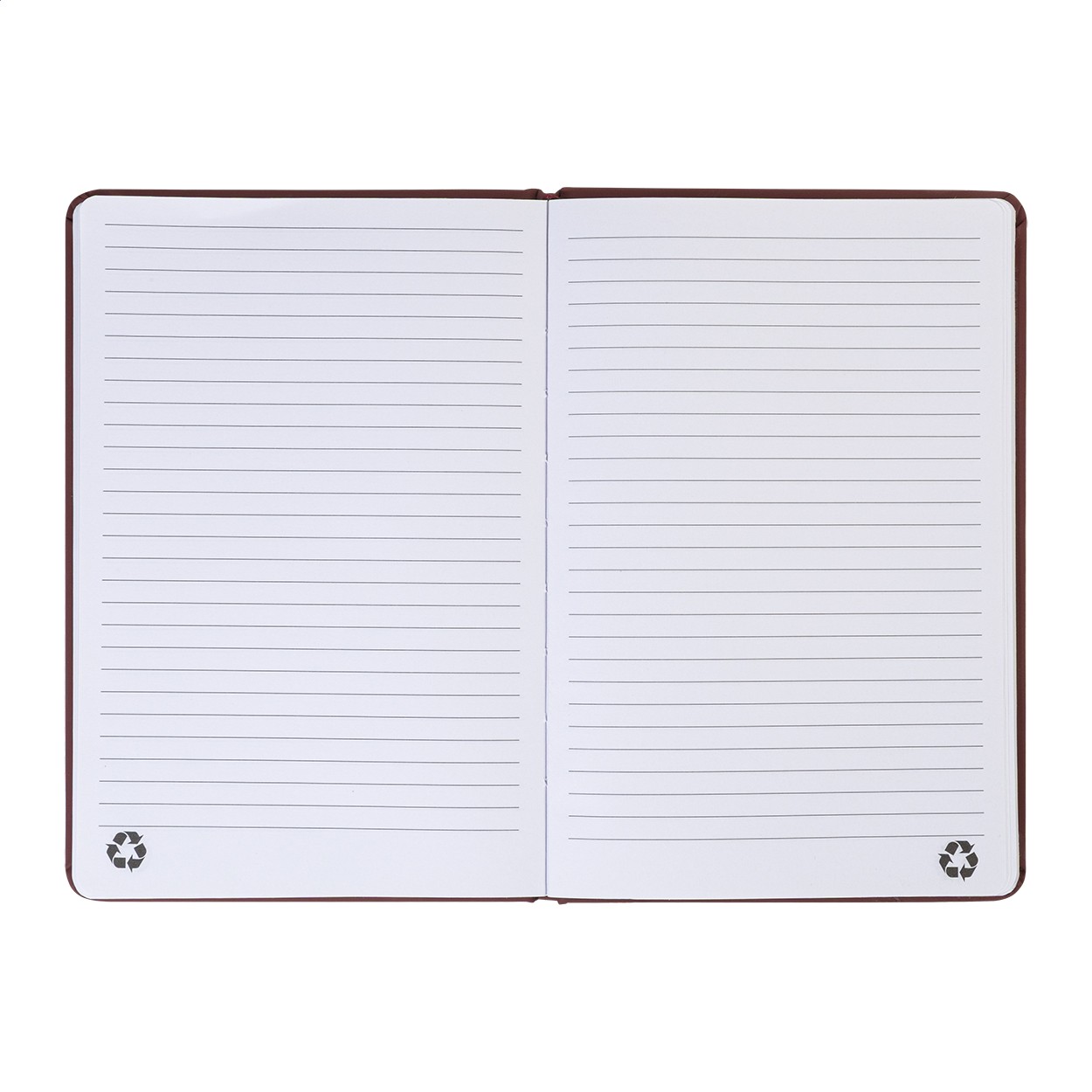 Caiet cu coperta din piele PU reciclată, cu 100 de foi dictando, din hârtie reciclată. Cu semn de carte de culoare asortată și bandă de cauciuc. Dimensiune A5.