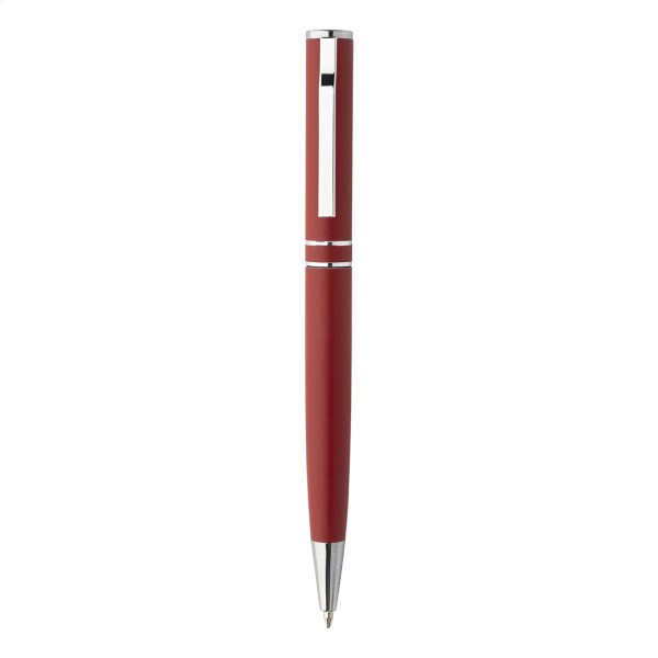 Pix cu bilă, din aluminiu reciclat, cu piese și inele cromate. În cutie cadou neagră. Cu mină albastră.
